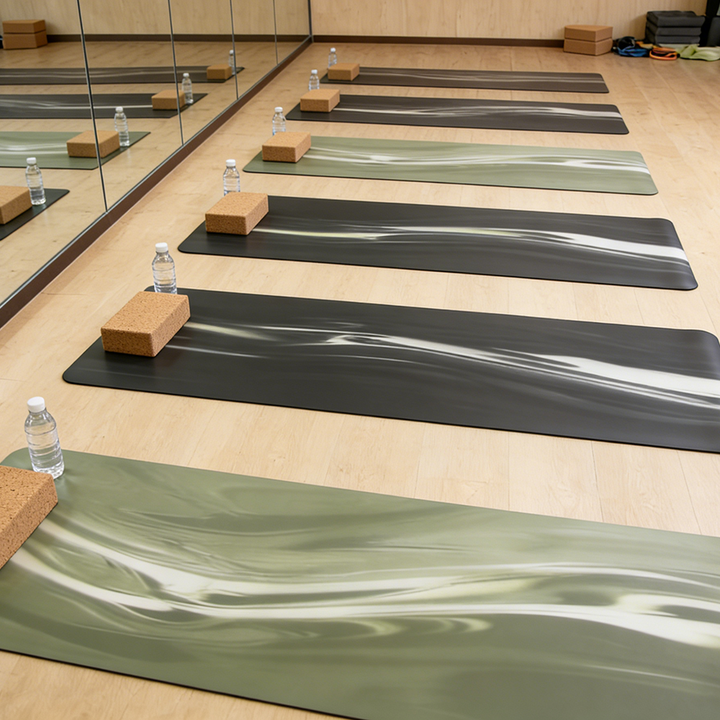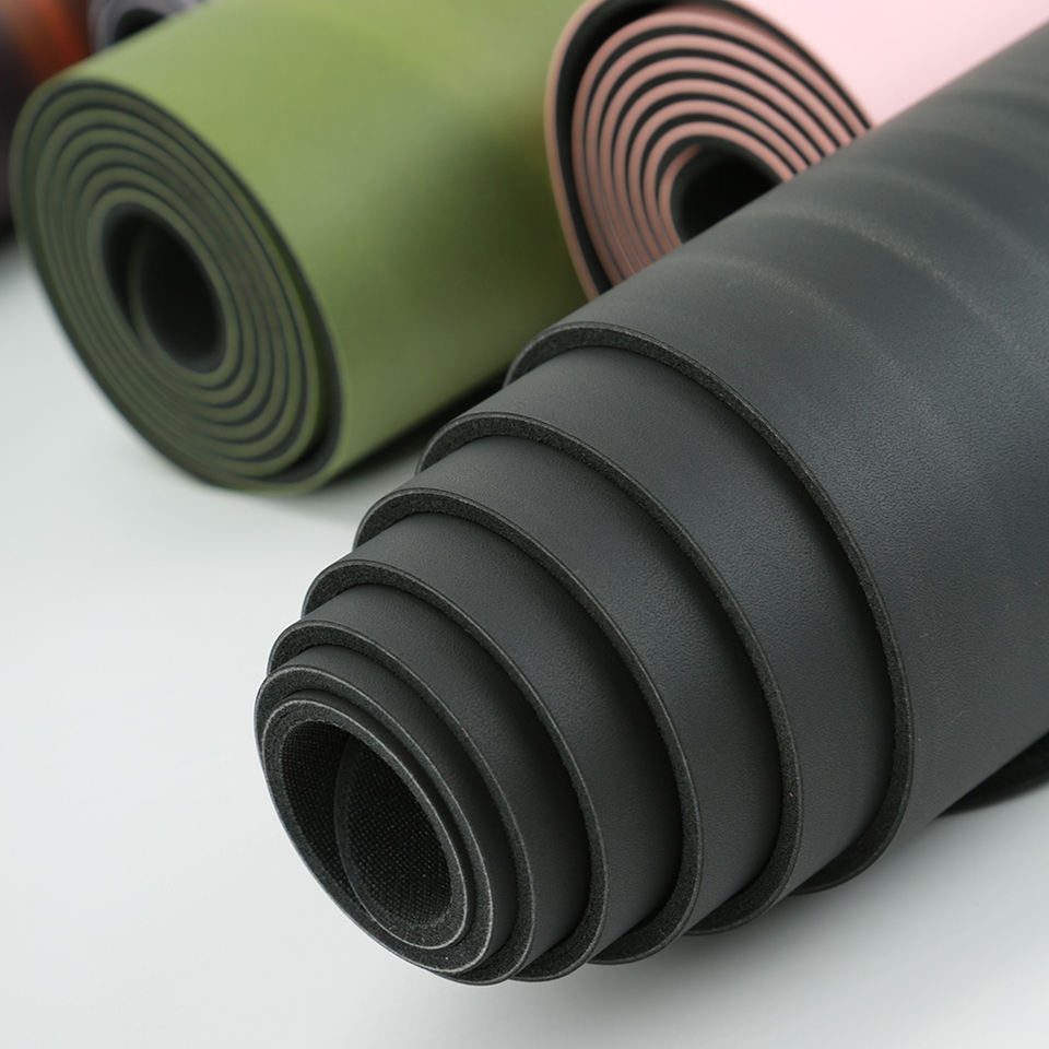 เสื่อโยคะยาง PU สองสี ความหนาแน่นสูง กันลื่น ลายแบบกำหนดเอง พร้อมสายสะพายเข้าชุด