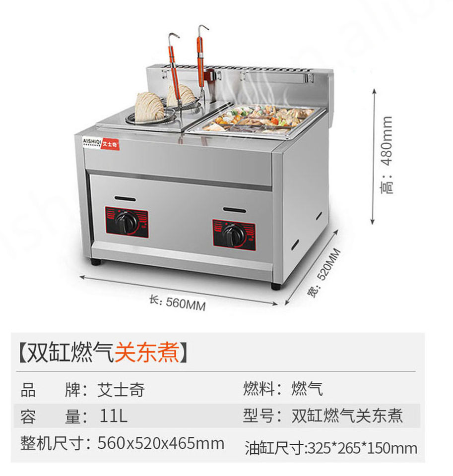 เครื่องทอดแก๊สแบบสองถัง สามหัวเตา 220V รับประกัน 1 ปี ขนาด 825x500x480 มม. น้ำหนัก 10 กก. เหมาะสำหรับร้านมาลาตัง ผลิตในกวางตุ้ง