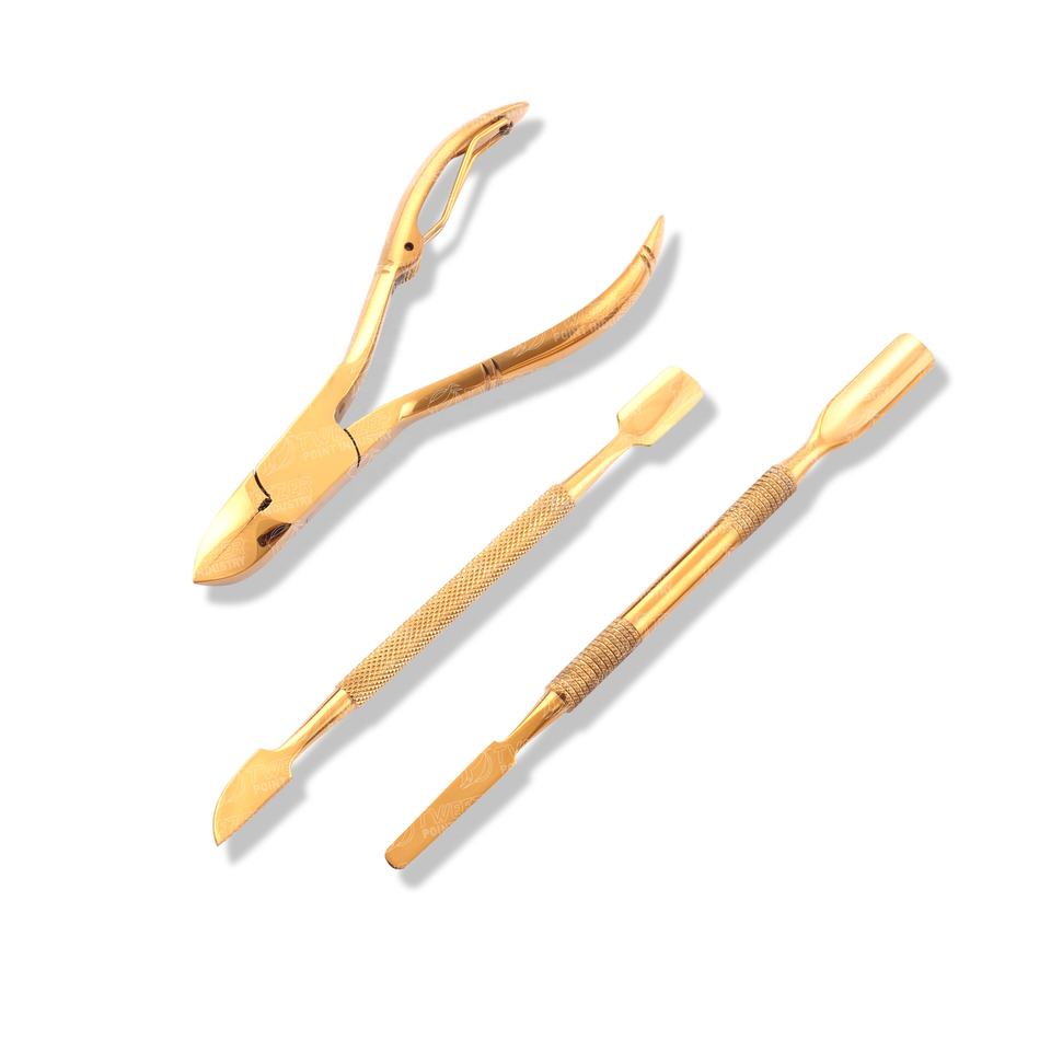 ที่ดันหนังกำพร้าที่ขัดเล็บแบบสองชั้นทรงสามเหลี่ยมเครื่องมือทำเล็บเสริมสวยเครื่องมือขูดหนังกำพร้าสีทอง