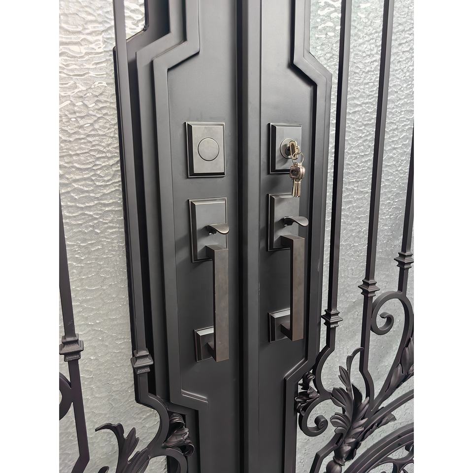 ประตูเหล็กดัดทางเข้าคู่พร้อมปีกเทมเปอร์ดีไซน์กราฟิกทางเข้าแบบทันสมัยกันขโมยภายนอก5ปี
