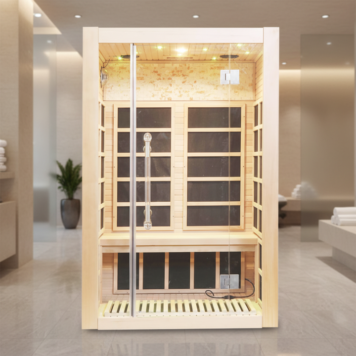 ห้องซาวน่าอินฟราเรดแบบคู่ พร้อมแผงควบคุม WIFI ห้องซาวน่าในร่มพร้อมกระจก ขายดีที่สุดในสหรัฐอเมริกา