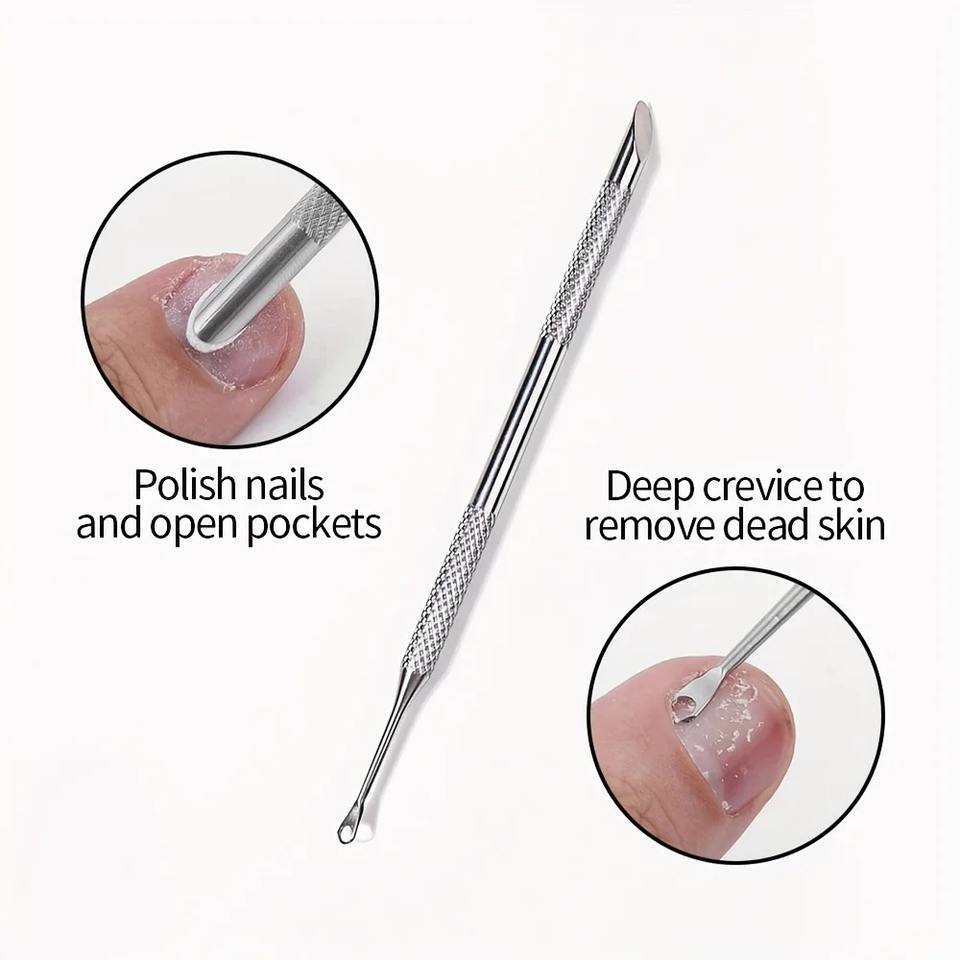 ที่ดันหนังกำพร้าแบบสองหัว ทำจากสแตนเลส ใช้สำหรับขจัดหนังกำพร้า ขัดผิว ทำความสะอาดผิวที่ตายแล้ว รูปทรงวงกลม ปลายตัดเฉียง ใช้สำหรับทำเล็บ