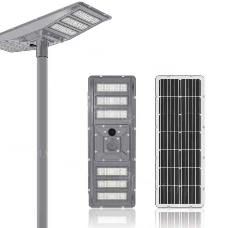 ไฟถนนโซลาร์เซลล์แบบรวมทุกอย่างในหนึ่งเดียว หัวคู่ 2 ด้าน 2 ข้าง กำลังไฟ 30W 60W 90W 120W 150W 300W มาตรฐาน IP65 พร้อมเซ็นเซอร์ตรวจจับความเคลื่อนไหว