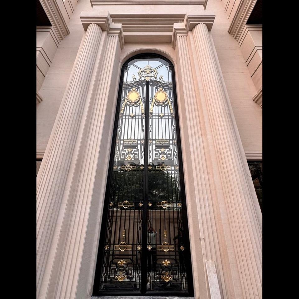 ประตูทางเข้าวิลล่าหรูหรา ดีไซน์ทันสมัย แบบสองชั้น พร้อมตกแต่งด้วยทองเหลืองและกระจก ประตูรักษาความปลอดภัยภายนอกอาคาร