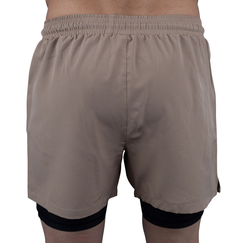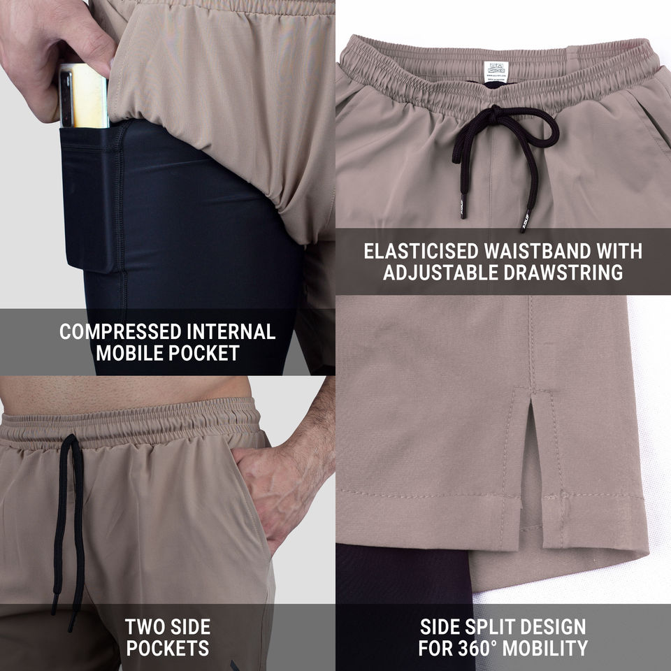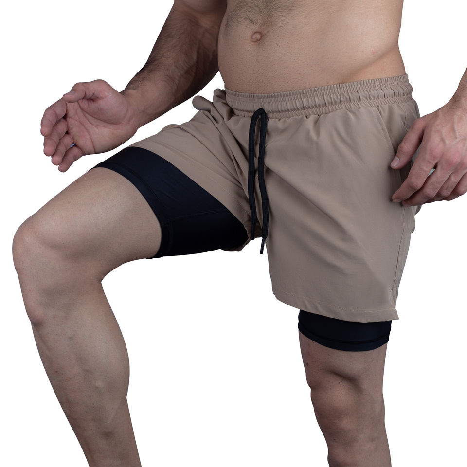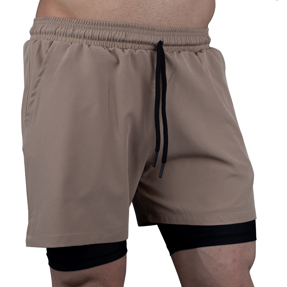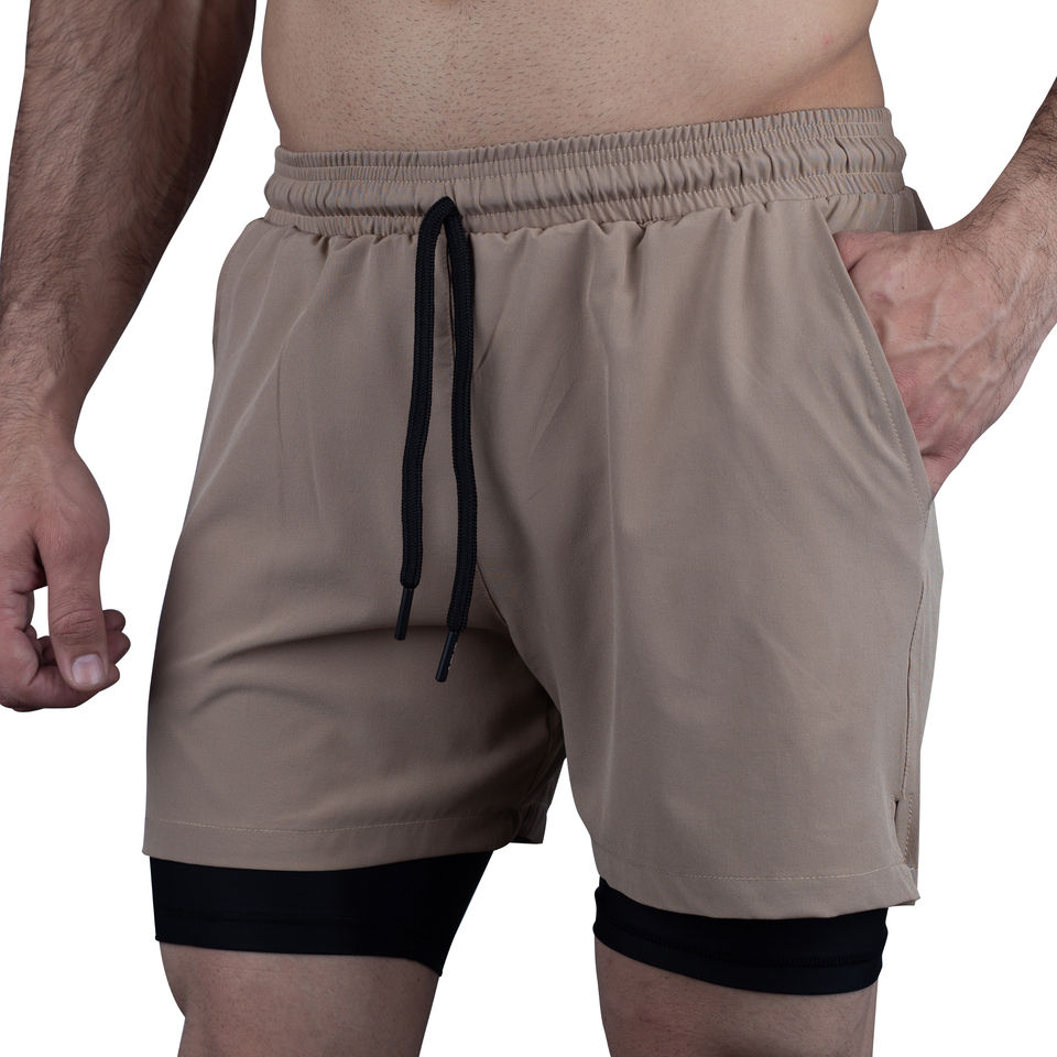 กางเกงขาสั้นออกกำลังกายผู้ชายแบบแห้งเร็วสองชั้น 100% โพลีเอสเตอร์ ชุดกีฬาลำลอง กางเกงวิ่งรัดรูปมีกระเป๋าสำหรับออกกำลังกาย