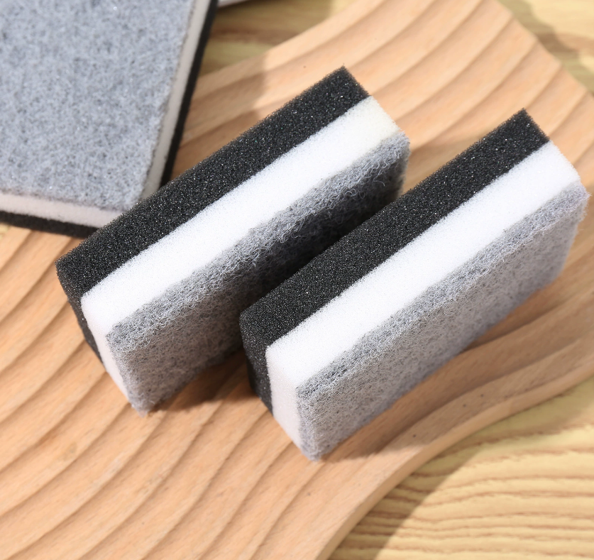 แผ่นฟองน้ำขัดแบบนอนวูฟเวนสองชั้นพร้อมแกนโฟม PU ความหนาแน่นสูงทนทานต่อการทำความสะอาดสำหรับใช้ในครัวเรือน