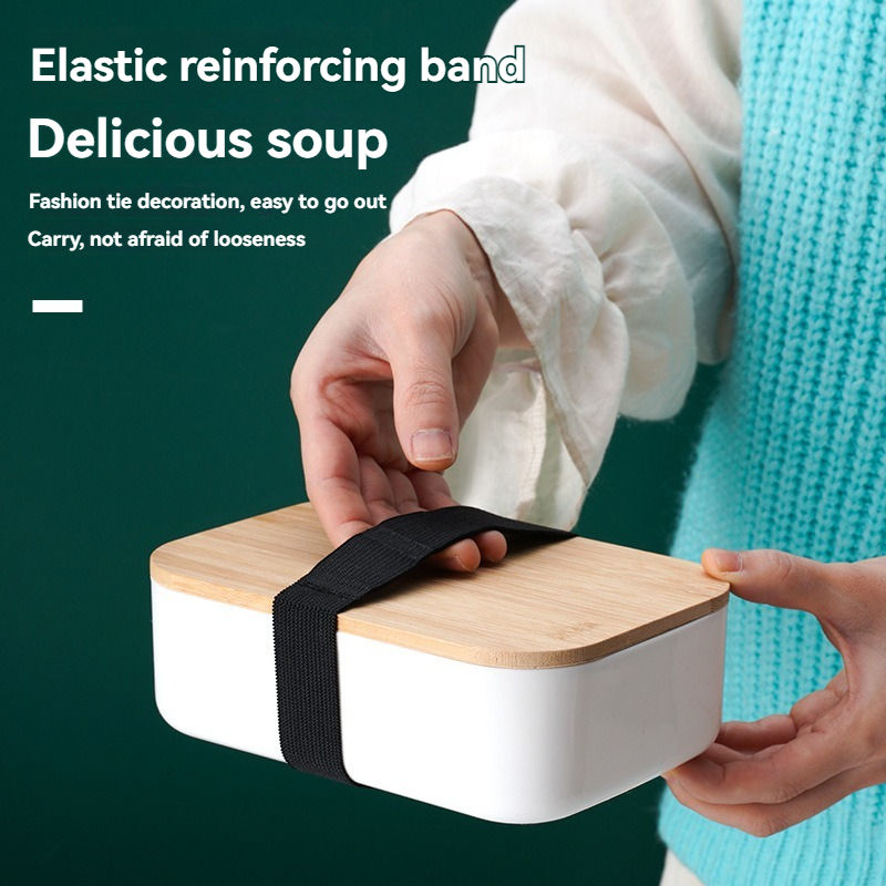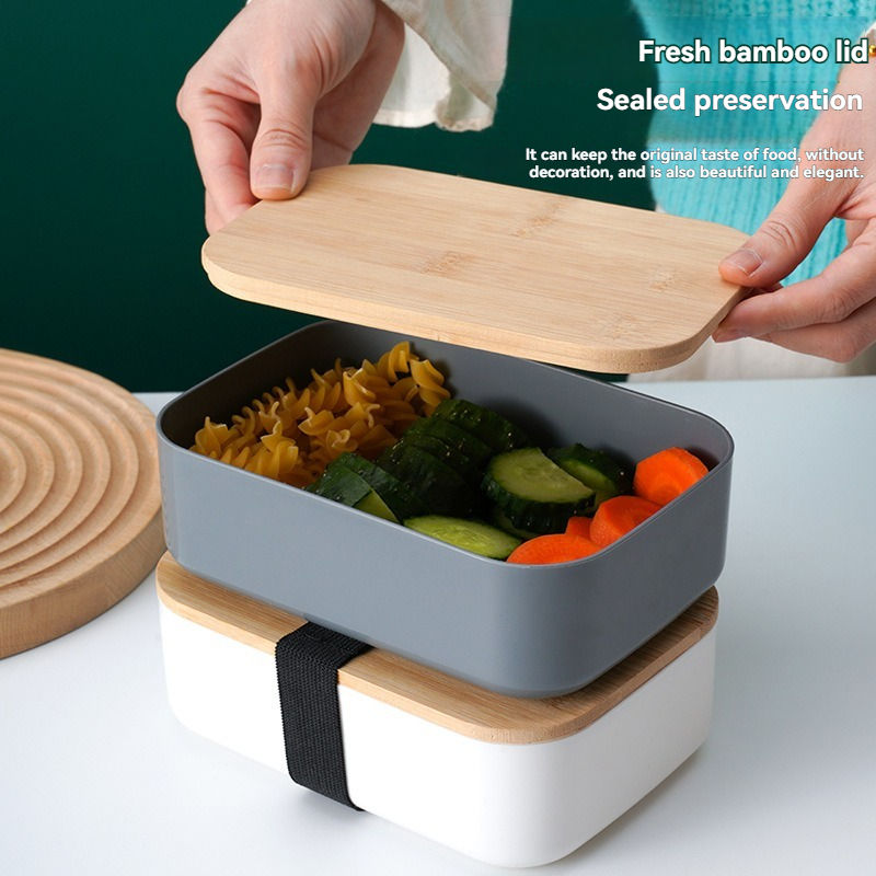 กล่องข้าวสองชั้นฝาไม้ วัสดุฟางข้าวสาลีและพลาสติก PP สำหรับนักเรียน พร้อมฟังก์ชั่นไมโครเวฟ กล่องเบนโตะเกรดอาหาร
