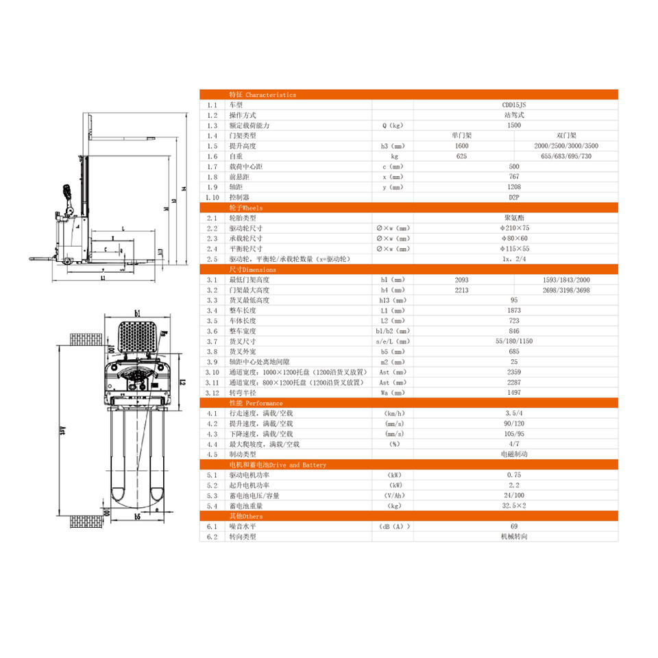 รถยกพาเลทไฟฟ้าแบบเดินตาม รับน้ำหนัก 1500 กก. ยกสูงได้ 1600 ถึง 3500 มม. สำหรับใช้ในคลังสินค้า