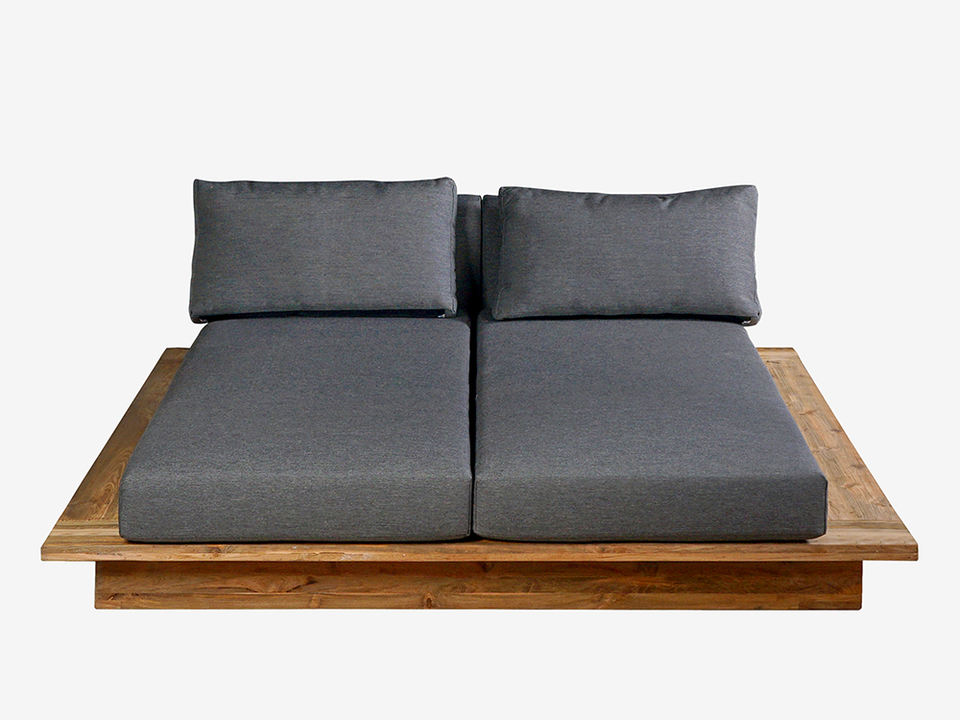 Double Lounger with Solid Teak Base and Plush Grey Cushions Modern Minimalist Outdoor or Indoor Relaxation Furniture
