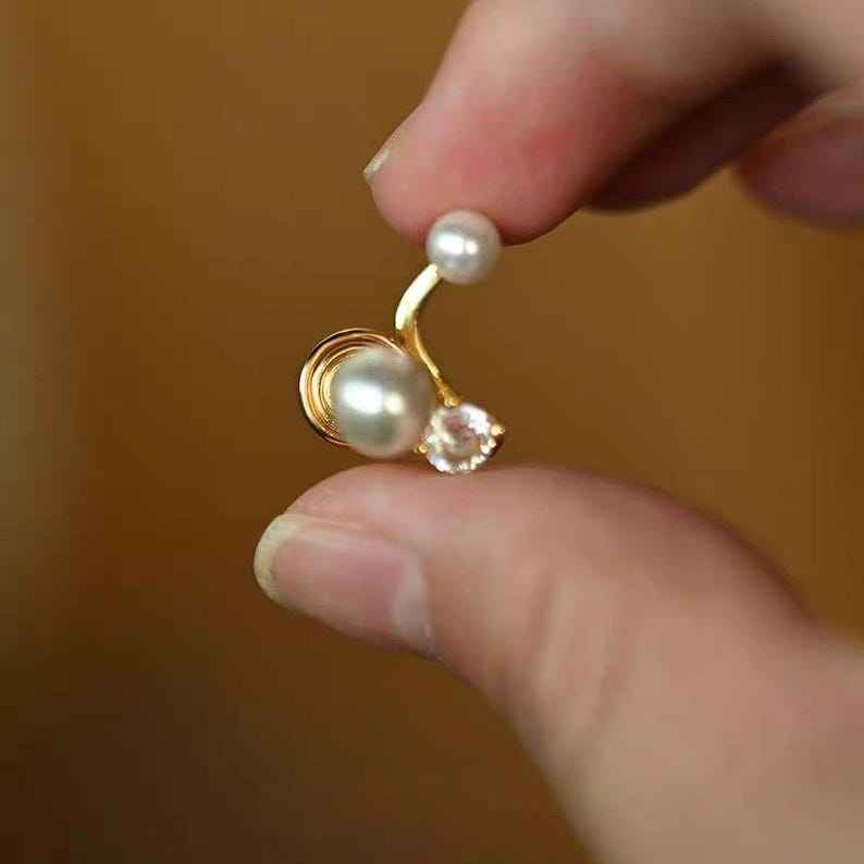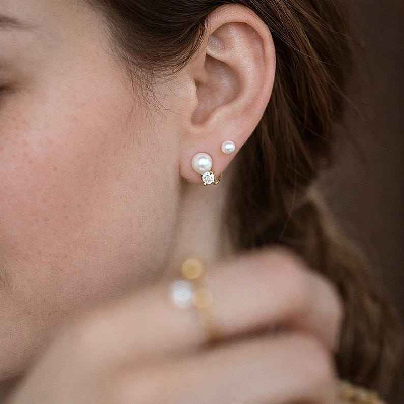 ต่างหูแบบหนีบมุกคู่ สองรูเจาะ สไตล์มินิมอล ตุ้มหูแบบหนีบ เงินแท้ 925 ชุบทอง 14K