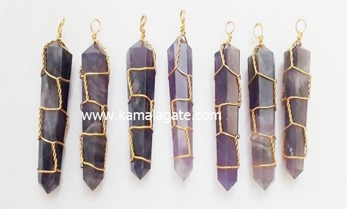 Double-Point Pencil Pendant Natural Amethyst Gemstone Golden Wire Wrap Hexagonal Pattern Fashionable Pendants Charms for Sale