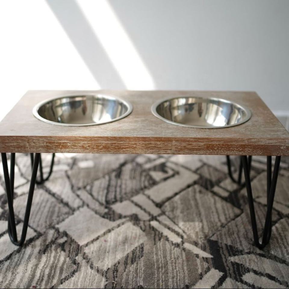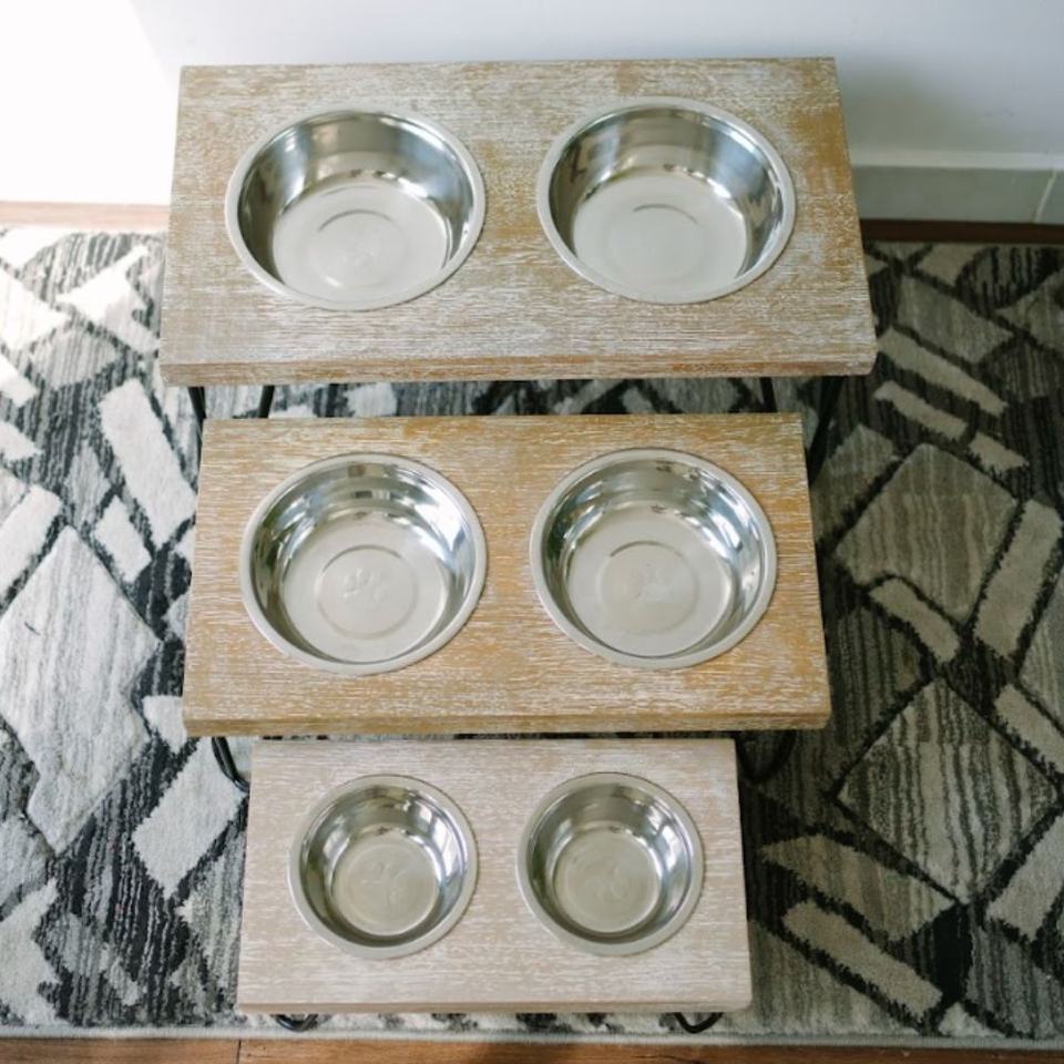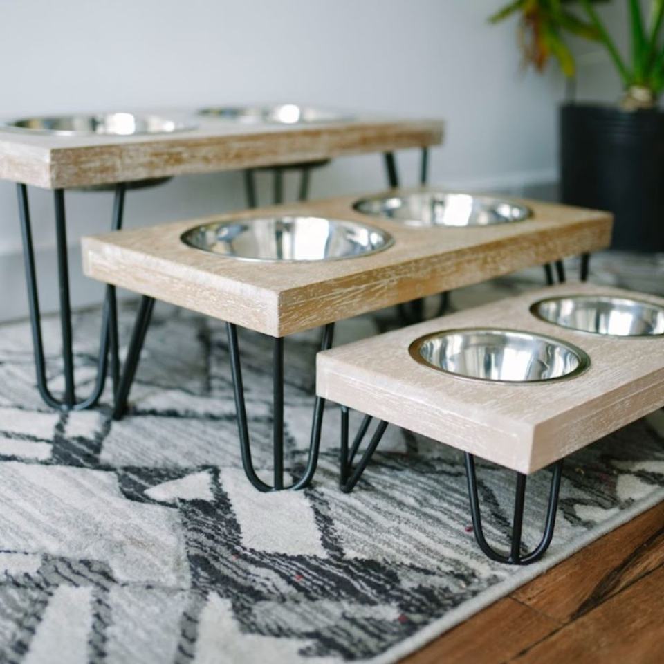 ชามไม้ด้านบนและกรอบโลหะสีดำสำหรับสุนัขและแมวทำจากสเตนเลสสตีลทรงสี่เหลี่ยมมุมฉากเป็นมิตรต่อสิ่งแวดล้อม