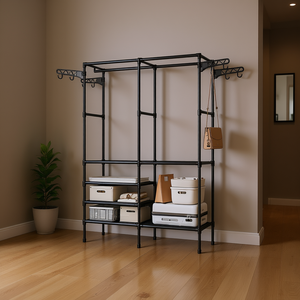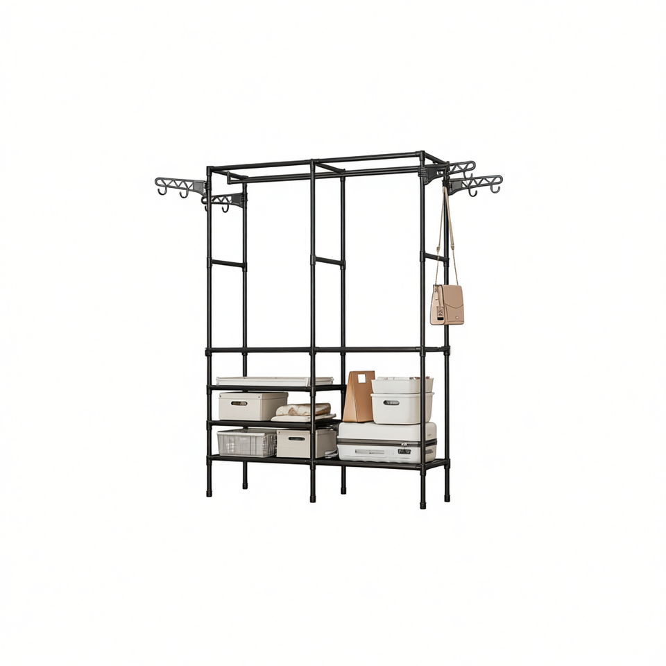 ราวแขวนเสื้อแบบสองแถว 3 ชั้น ชั้นวางโลหะ ทันสมัย ตั้งพื้นได้ เฟอร์นิเจอร์บ้าน ดีไซน์มินิมอล สำหรับจัดเก็บในห้องนั่งเล่น