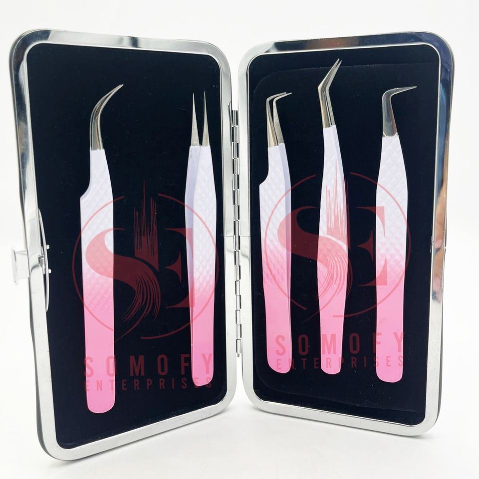 แหนบปลายขนตาสีชมพูสีขาวสแตนเลสสตีลแบบญี่ปุ่นที่ผ่านการทดสอบด้วยมือเครื่องมือต่อขนตาฉลากส่วนตัวคงทน