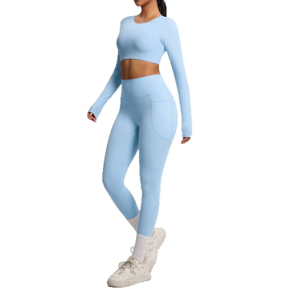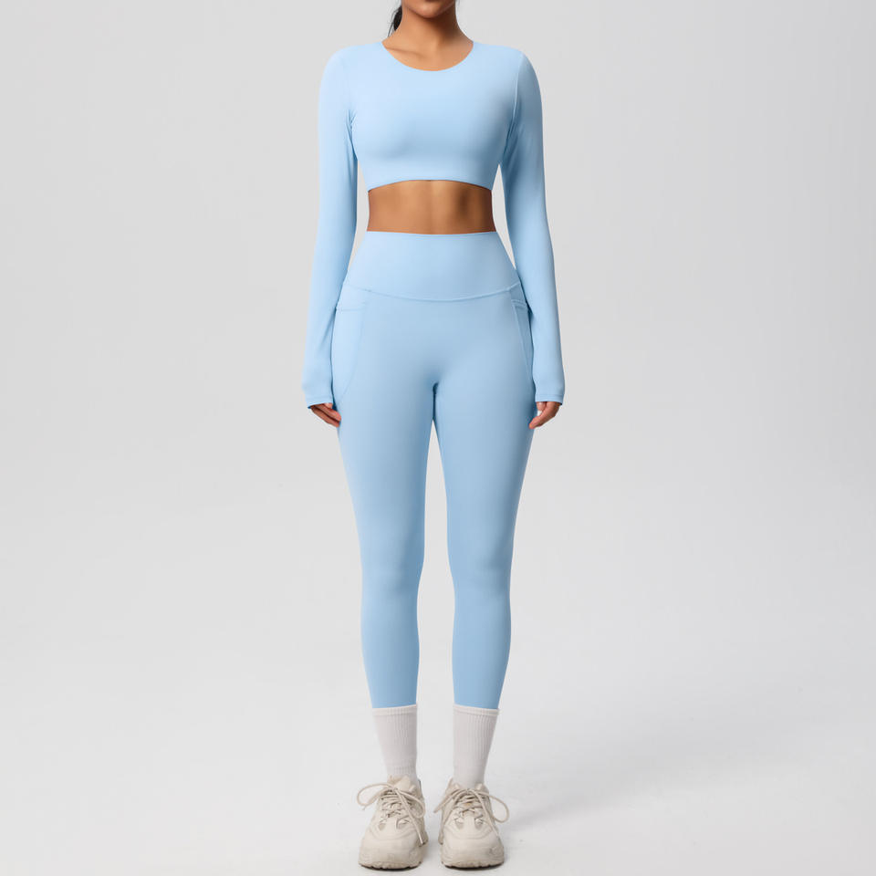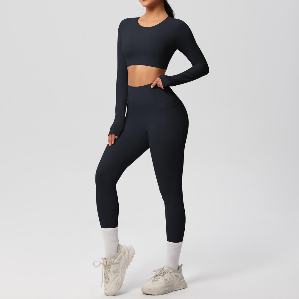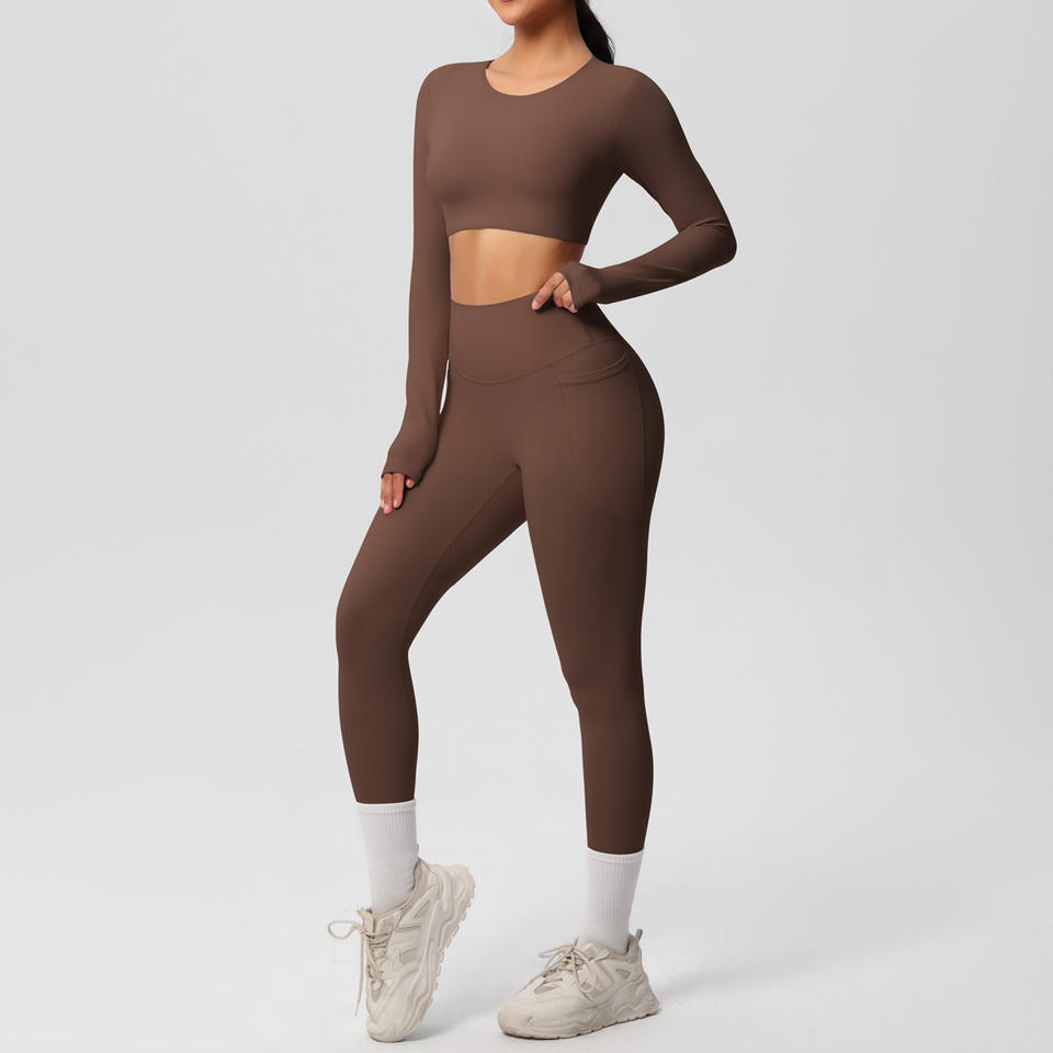ชุดโยคะสองชิ้นผ้ายืดหยุ่นสูงระบายอากาศได้ดีแปรงสองด้านสีพื้นสำหรับเล่นกีฬาวิ่งออกกำลังกาย