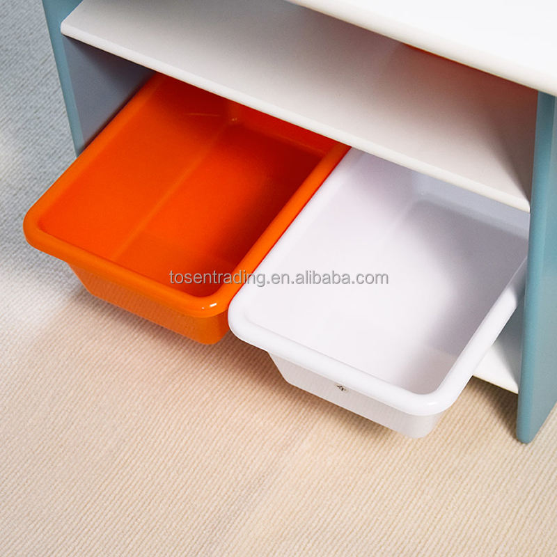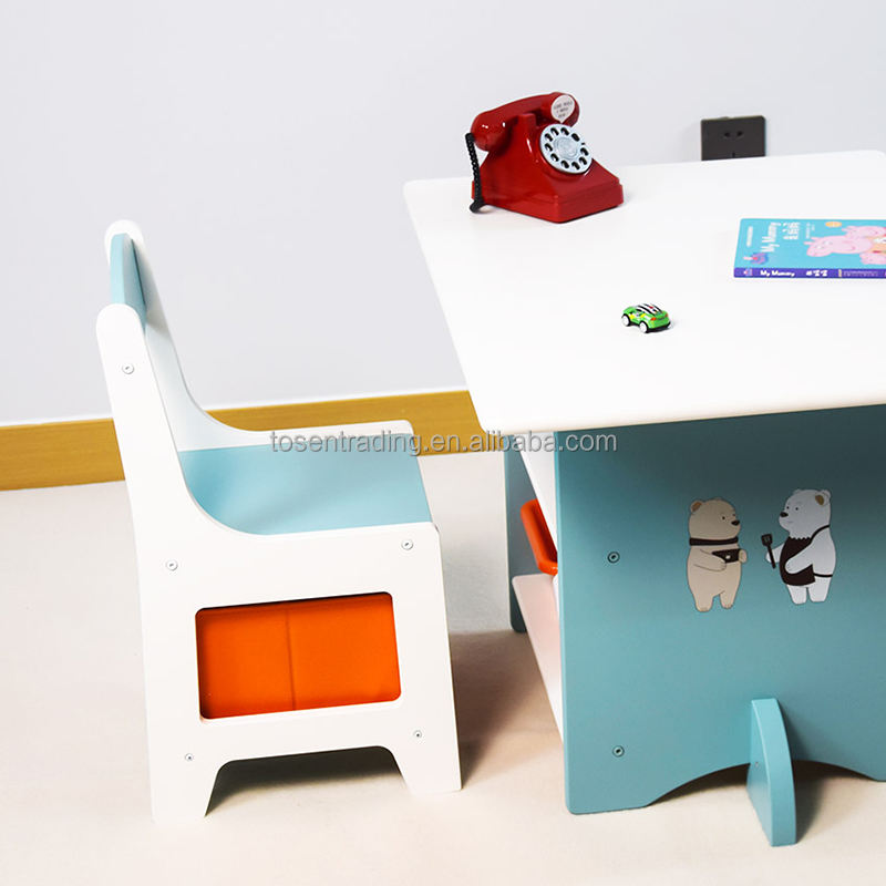 ชุดโต๊ะและเก้าอี้เด็กสองด้านแบบทันสมัย พร้อมกล่องเก็บของ คุณสมบัติด้านความปลอดภัย โต๊ะกิจกรรมไม้สำหรับห้องนอน
