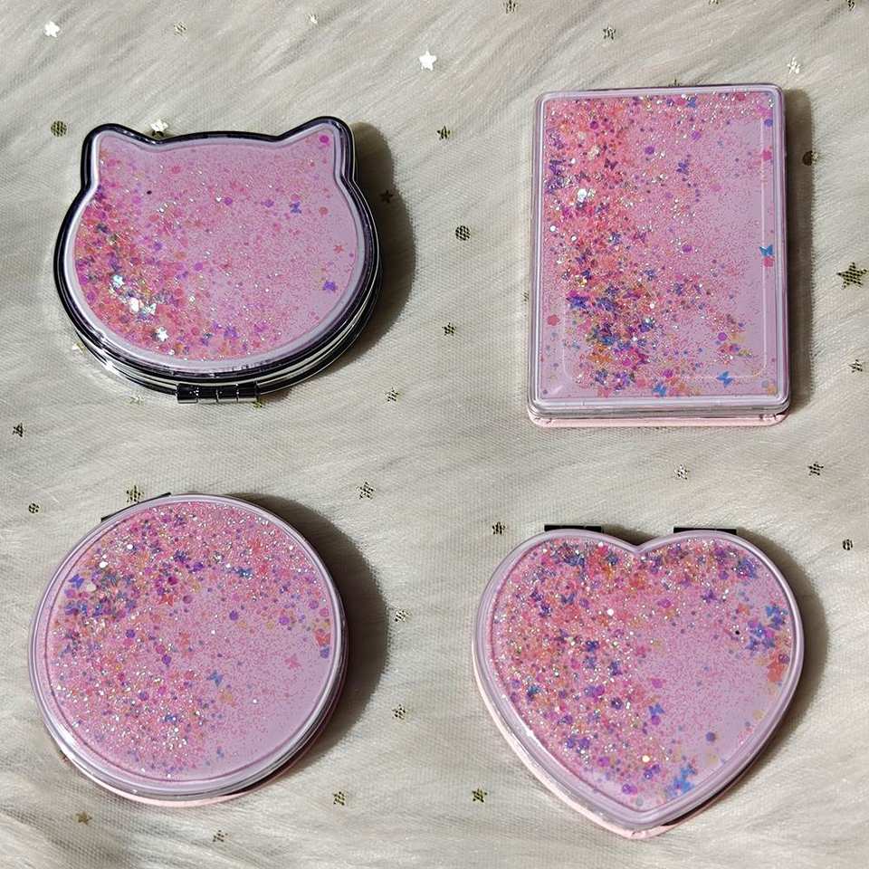 กระจกแต่งหน้าสองด้านแบบมีประกายวิบวับ สีชมพู น่ารัก รูปทรงสี่เหลี่ยม วงกลม หัวใจ แมว พร้อมกระจกขยาย