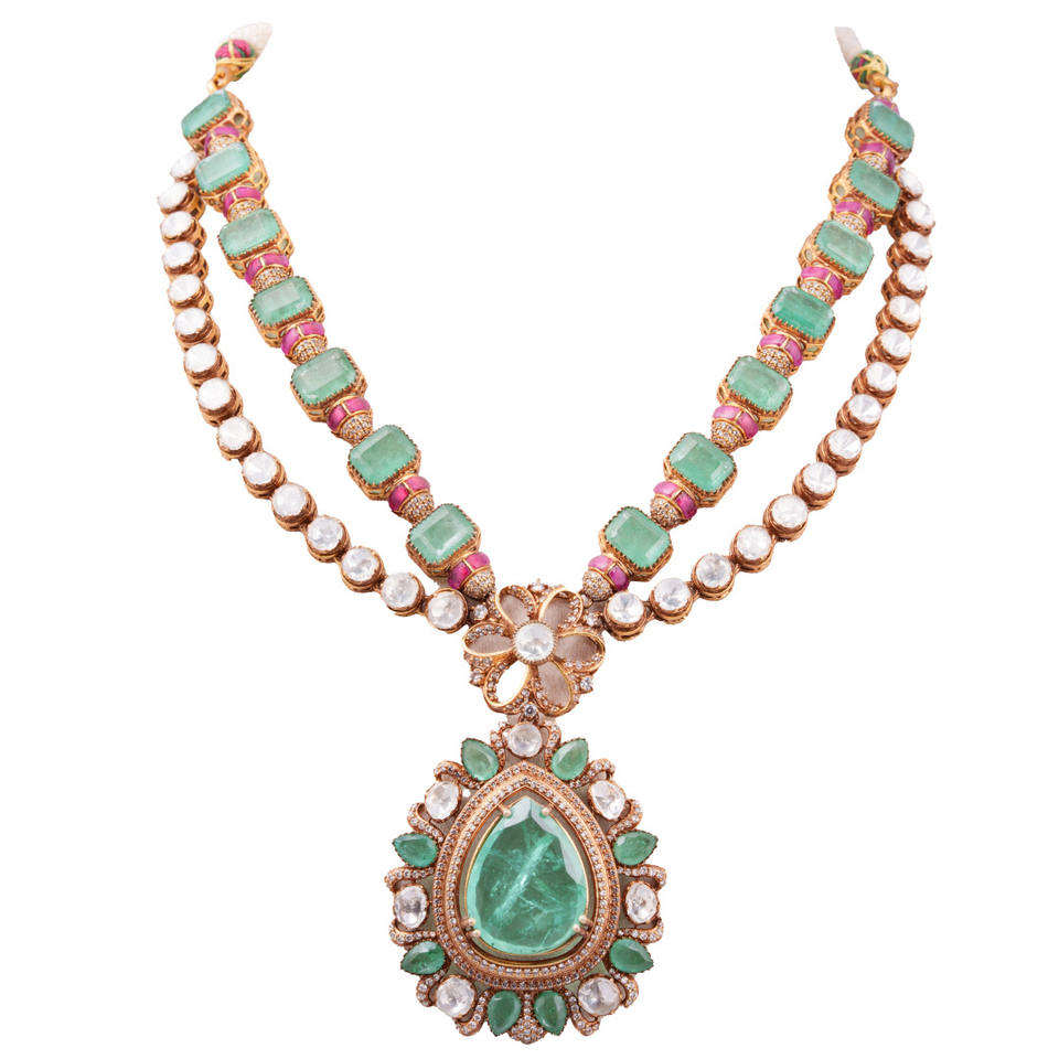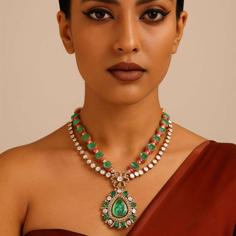 เครื่องประดับเจ้าสาวแบบดั้งเดิมประดับมรกต ทับทิม พอลกี้ และเพชรแบบสองเส้น สำหรับผู้หญิง สไตล์จักรพรรดินี รุ่นการ์เดน กาจาห์ เงินแท้ 925