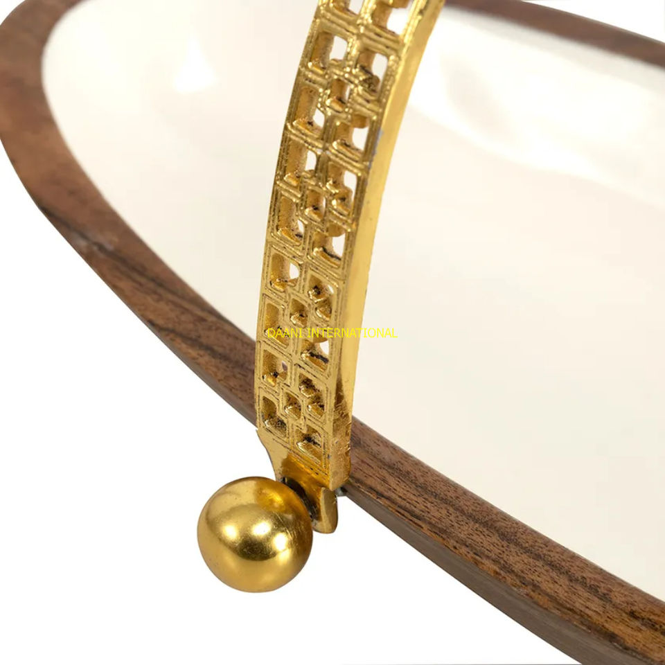 ชามเสิร์ฟไม้สองชั้นพร้อมที่จับสีทองสำหรับใส่ขนมขบเคี้ยวสำหรับผลไม้แห้งถั่วลูกกวาดห้องครัวโต๊ะรับประทานอาหารใช้ในงานปาร์ตี้
