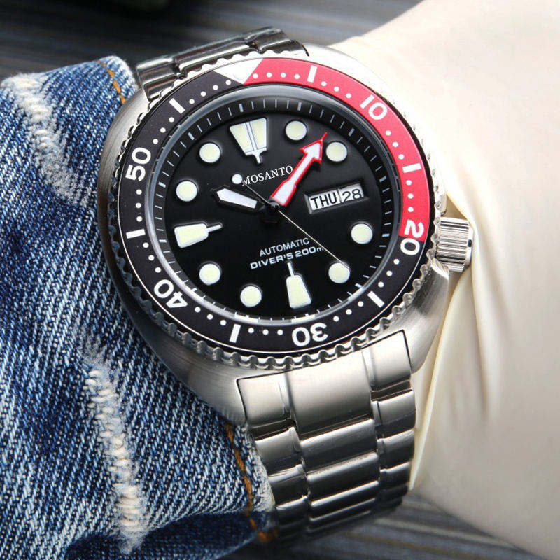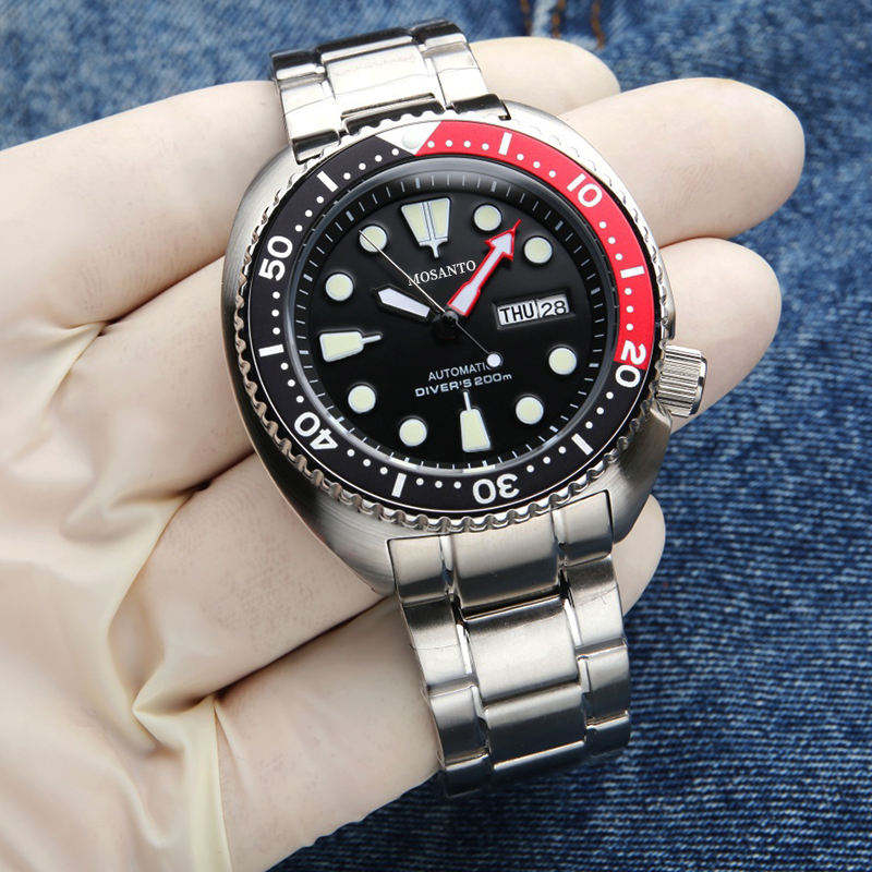 นาฬิกาข้อมือผู้ชายแบบอัตโนมัติเต็มรูปแบบ รุ่นคลาสสิค อะบาโลน ซีรีส์ สีดำและสีแดงสองสี พร้อมฟังก์ชั่นเรืองแสงและปฏิทินคู่ สำหรับดำน้ำและเล่นกีฬา