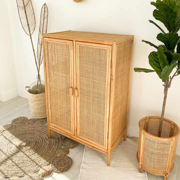 ตู้เสื้อผ้าแบบสองประตูตู้ไม้และหวายธรรมชาติ
