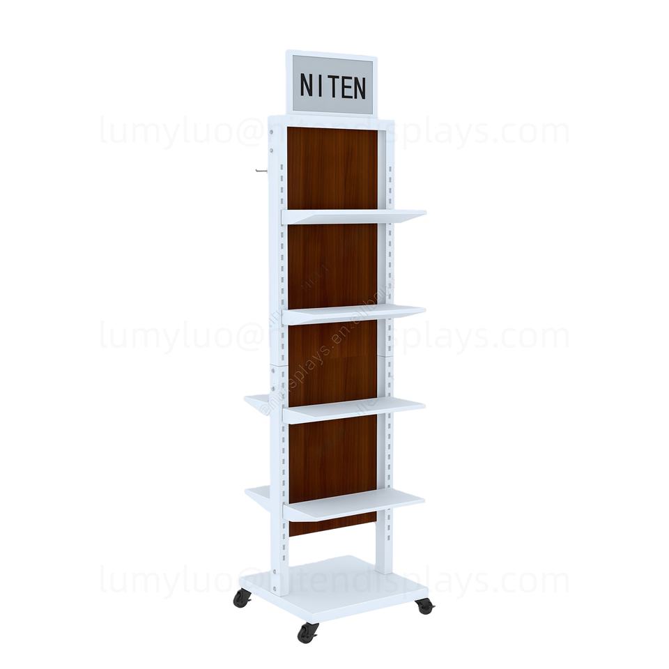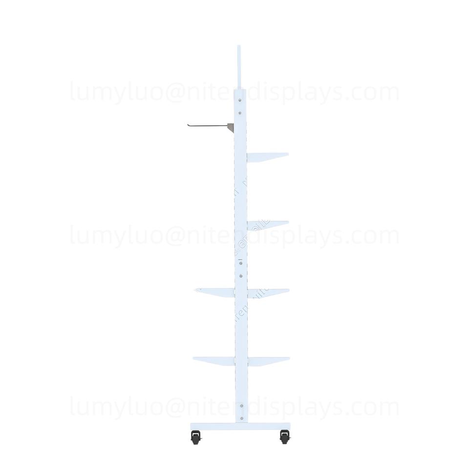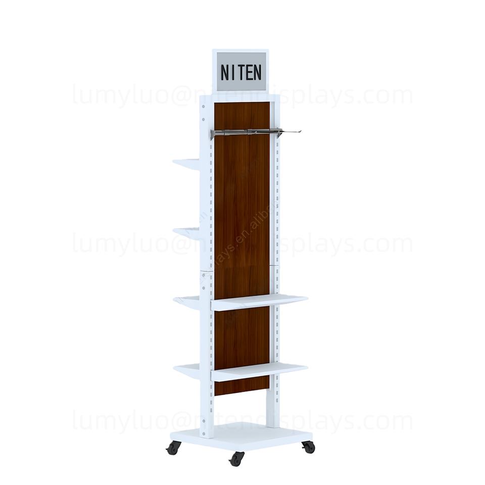 ราวแขวนเสื้อผ้าเหล็กสองด้านแบบมีล้อ ปรับความสูงได้ พร้อมตะขอ ชั้นวางแบบเคลื่อนที่สำหรับร้านค้า