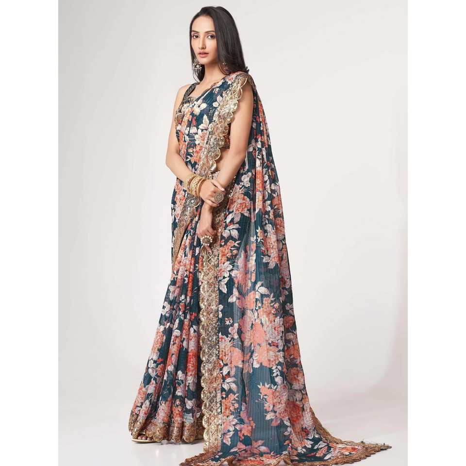 Dove Blue Floral Print Organza Evening Dress Beautiful Party Saree with Blouse