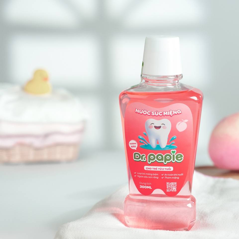 น้ำยาบ้วนปากเด็ก ดร.ปาปี คิดส์ 2+ ปราศจากฟลูออไรด์ ปลอดภัยต่อการกลืน รสพีชธรรมชาติ ไซลิทอล ช่วยให้ลมหายใจสดชื่น ทำความสะอาดช่องปากอย่างอ่อนโยน