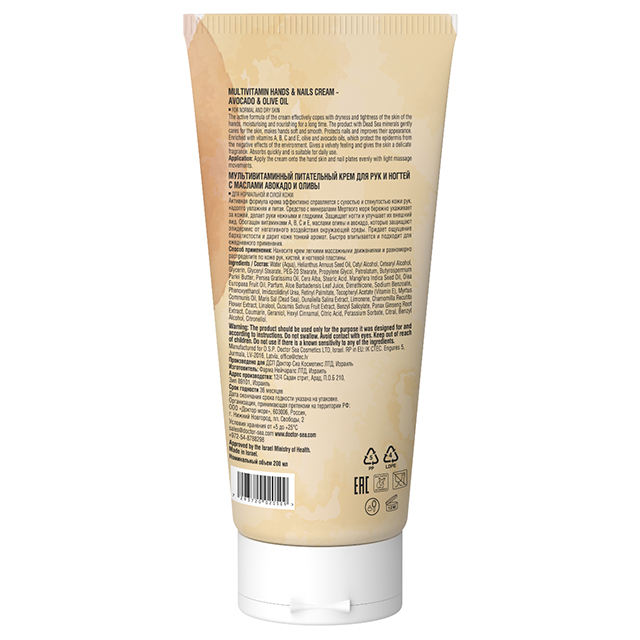 Dr.Sea Cosmetics Multivitamin Hands and Nails Cream With Avocado and Olive Oil Hand Cream for Normal and Dry Skin Types
