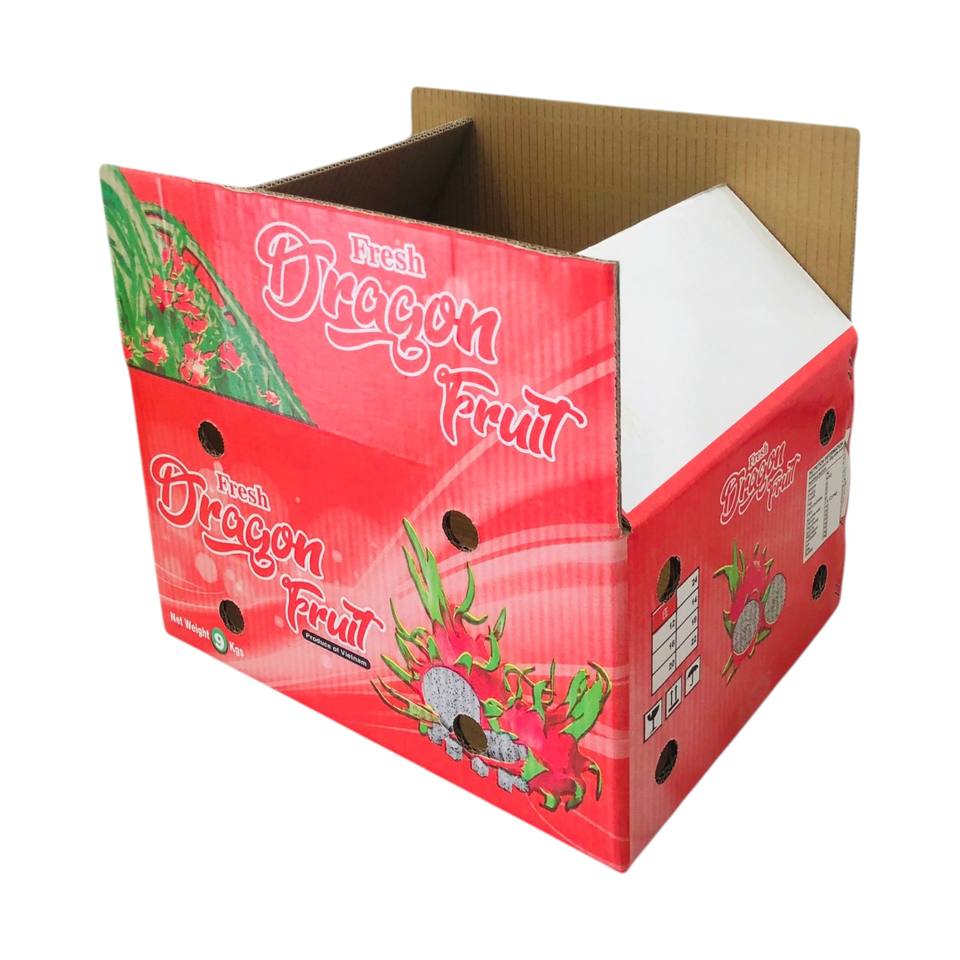 กล่องกระดาษลูกฟูกแบบกำหนดเองรีไซเคิลได้ เป็นมิตรกับสิ่งแวดล้อม พิมพ์เฟล็กโซ สำหรับบรรจุภัณฑ์ผลไม้ แป้ง และอาหารสัตว์ ยี่ห้อ Dragon Fruits EOM