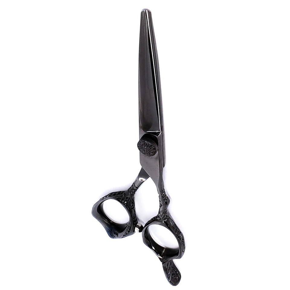 กรรไกรสแตนเลสสตีลสำหรับร้านเสริมสวยพร้อมที่วางนิ้วด้ามมังกรกรรไกรตัดผมเคลือบสีดำจากเยอรมัน