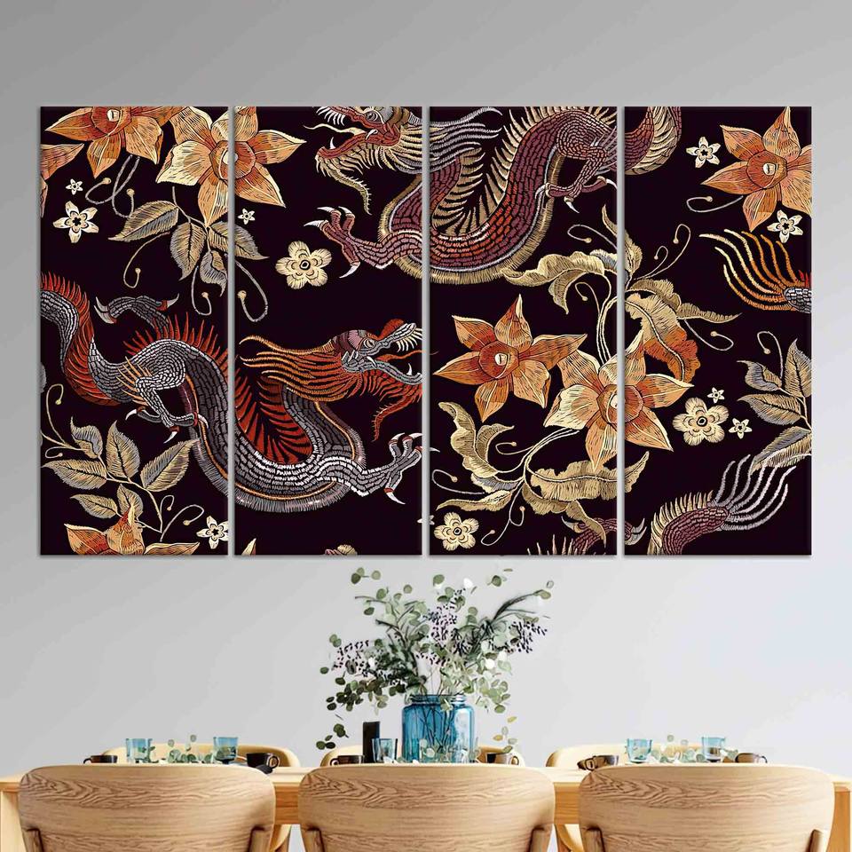 ศิลปะบนผืนผ้าใบพิมพ์ลายมังกรและดอกไม้: ของตกแต่งผนังลายเอเชียสุดหรู ชุดผ้าใบ 4 ชิ้น