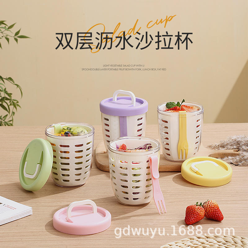 ถ้วยสลัดแบบมีที่ระบายน้ำพร้อมส้อม ภาชนะใส่ผลไม้แบบพกพา กล่องเก็บของพลาสติกป้องกันการรั่วซึมสำหรับการใช้งานกลางแจ้งสำหรับปิกนิก
