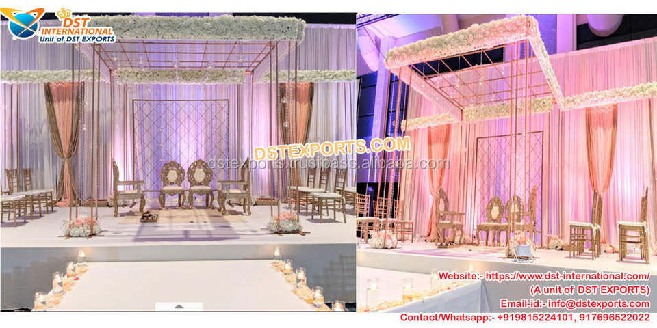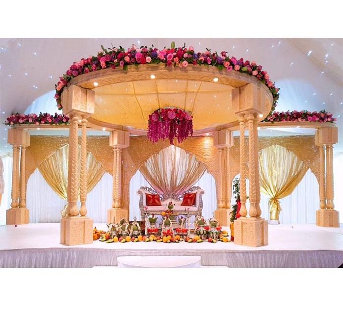 งานแต่งงานในฝัน ผู้ออกแบบตกแต่งมณฑปไฟเบอร์ งานแกะสลักมณฑปไฟเบอร์สำหรับงานแต่งงาน มณฑปงานแต่งงานแบบผสมผสานสไตล์อินเดีย มณฑปสีทองสำหรับงานแต่งงาน