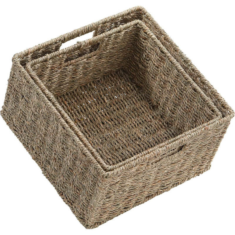 ชุดตะกร้าสานจากหญ้าทะเลตกแต่งลายสวยงาม 2 ใบ พร้อมหูหิ้ว สำหรับจัดเก็บและจัดระเบียบ ผลิตในเวียดนาม