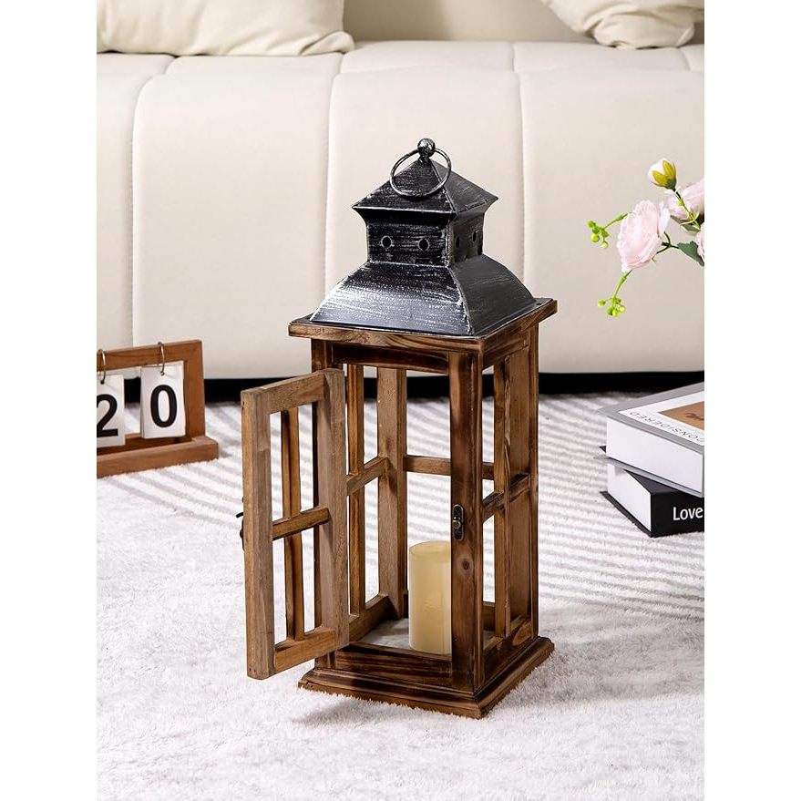 DreamCraft Set of 2 Large Rustic Burnt Wood Floor Lanterns Indoor Outdoor Hurricane Candle for Home Decor No Glass