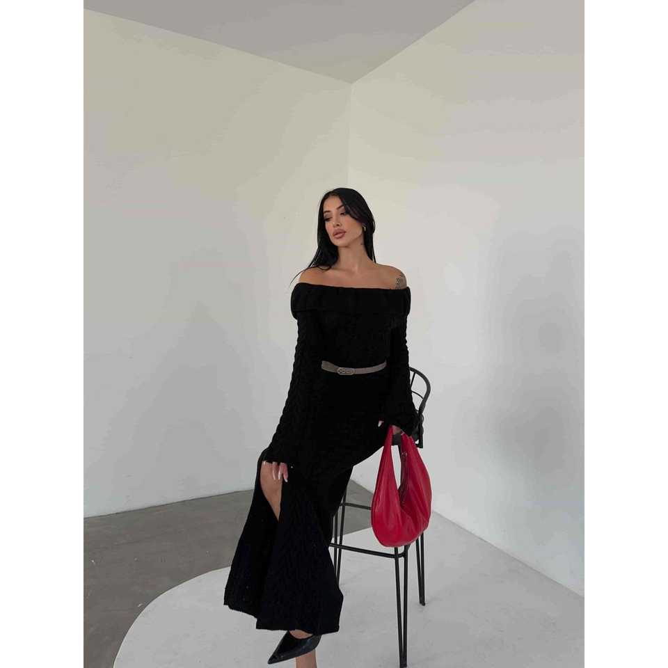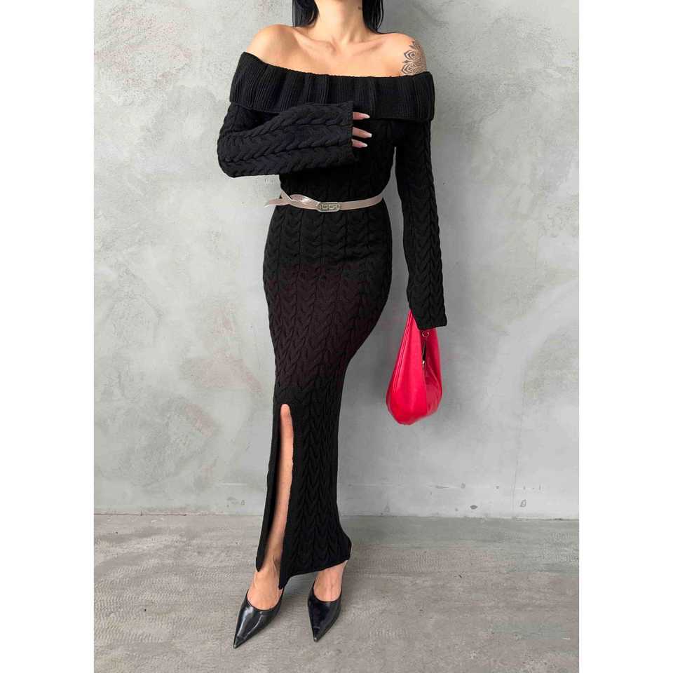 เดรสเดรส 1515 สีดำ เดรสลำลองแขนยาวแบบถักเปิดไหล่พร้อมเข็มขัดและดีเทลผ่าข้าง