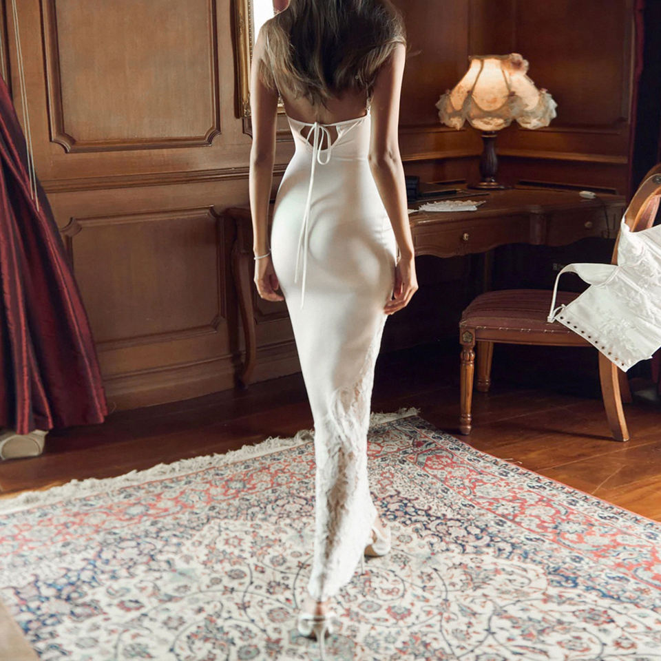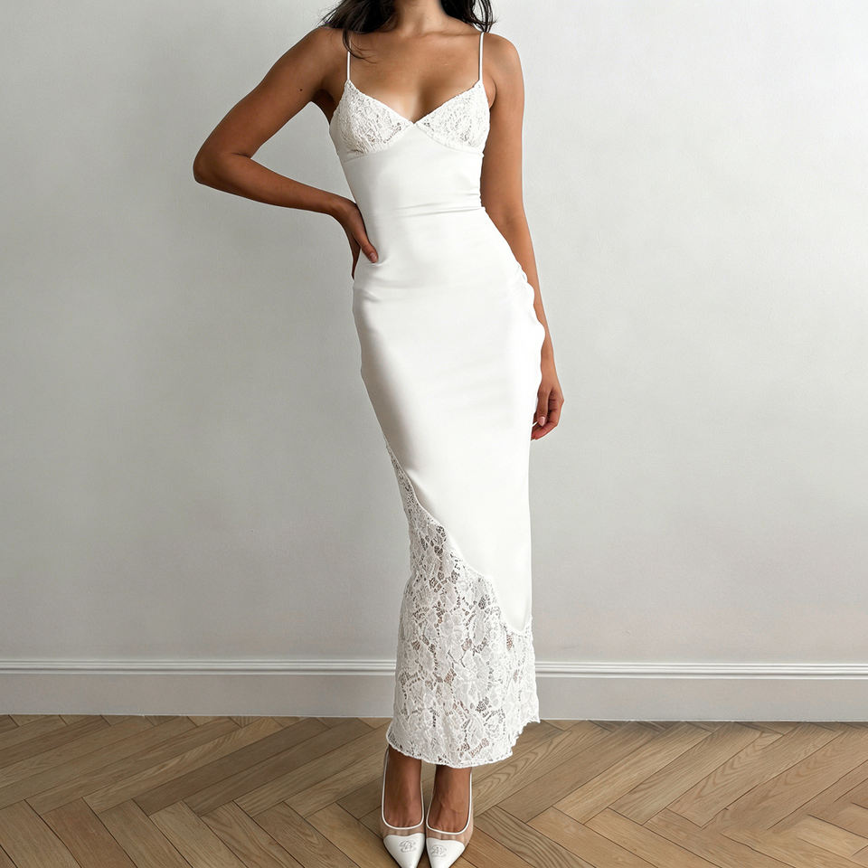 ชุดเดรสผู้หญิงลูกไม้เย็บปะติดปะต่อสายสปาเก็ตตี้เซ็กซี่สไตล์ยาวหรูหราสำหรับงานปาร์ตี้วันหยุดหรืองานเลี้ยง