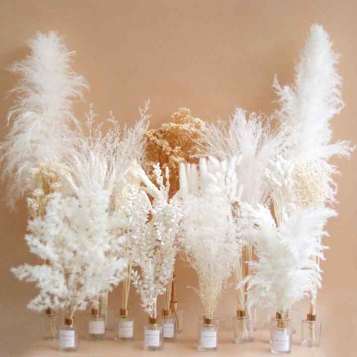 ชุดดอกไม้แห้ง ดอกกุหลาบแห้ง ต้นกกปัมปัสขนาดใหญ่ หญ้าหางกระต่าย ดอกยิปโซฟิลลา ดอกคริสตัล ดอกไฮเดรนเยีย ดอกปัมปัสแห้ง