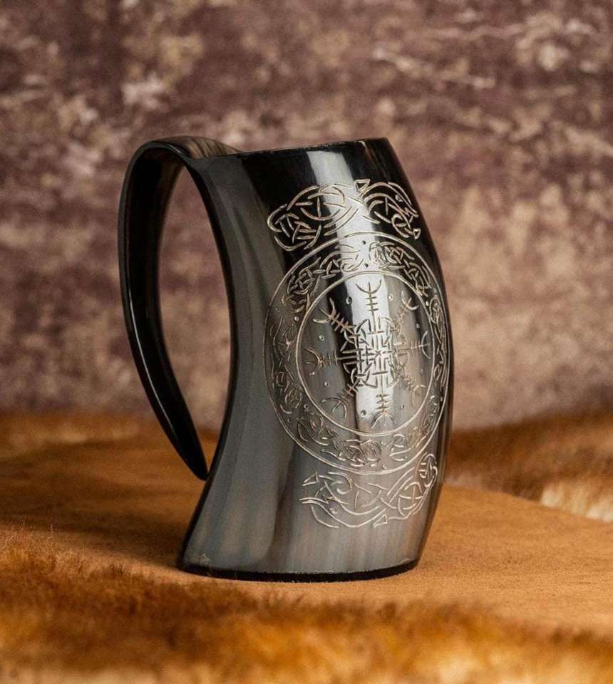 แก้วน้ำทำมือจากเขาสัตว์ธรรมชาติ ลายแกะสลักสุดฮิต รูปสัตว์ตามหลักศาสนา ฐานไม้ขนาดใหญ่ เป็นมิตรกับสิ่งแวดล้อม ปลอดภัยสำหรับอาหาร เคลือบเงา ทำด้วยมือ
