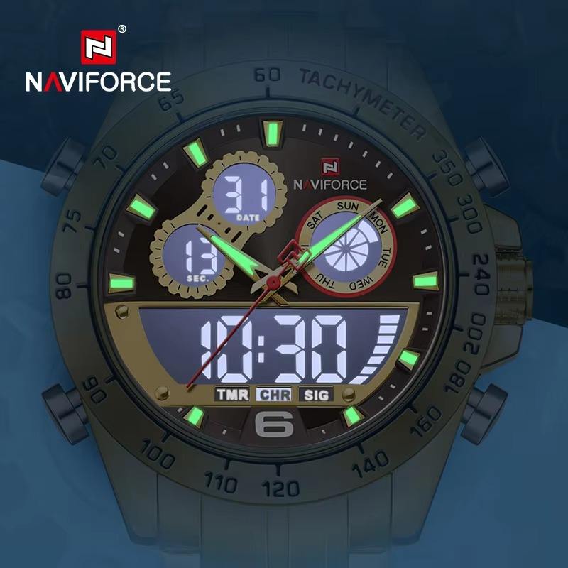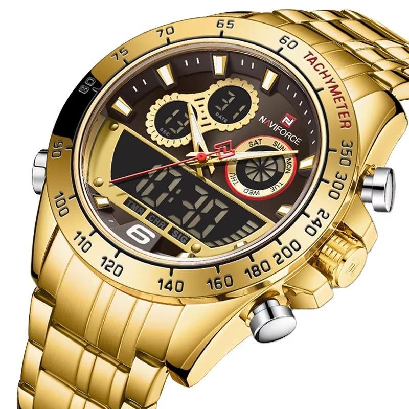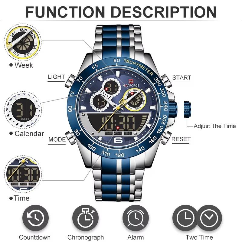 นาฬิกาข้อมือดิจิตอลสำหรับผู้ชายแฟชั่นหน้าจอคู่สแตนเลสสตีลจอแสดงผล LED นาฬิกาข้อมือควอตซ์สำหรับผู้ชาย