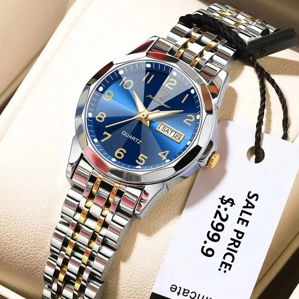 นาฬิกาข้อมือควอตซ์สแตนเลสสตีลกันน้ำสำหรับผู้หญิงตัวเรือนอัลลอยหรูหราดีไซน์ปฏิทินเรืองแสงสำหรับผู้หญิง
