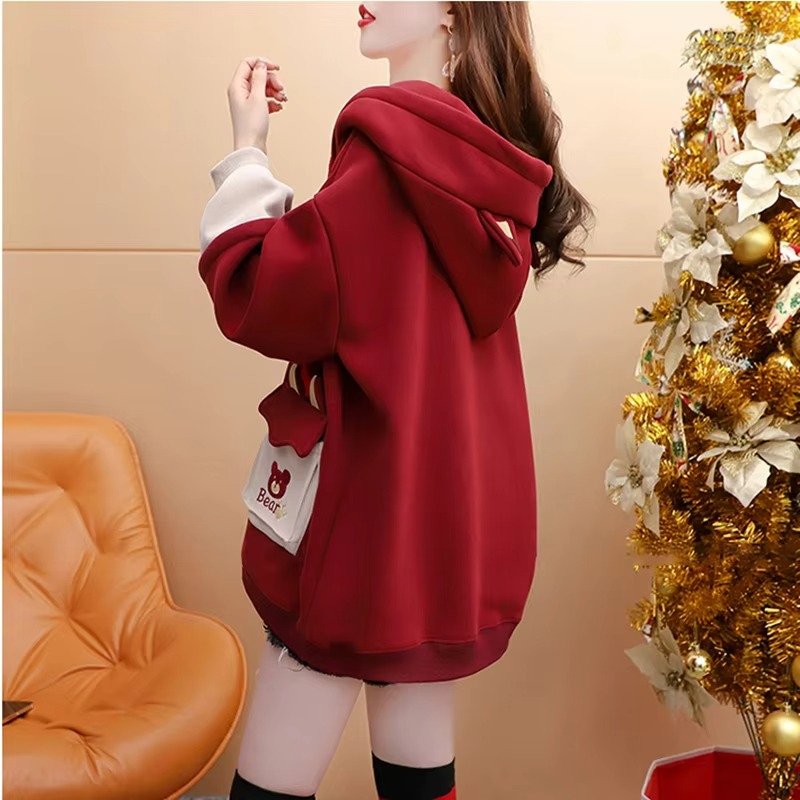 เสื้อฮู้ดดี้ผู้หญิงแบบไหล่ตก ผ้าหนา สำหรับฤดูใบไม้ร่วงและฤดูหนาว ผ้ากำมะหยี่ อุ่นสบาย สไตล์เกาหลี ลายการ์ตูนหมี ผ้าฝ้าย 100%