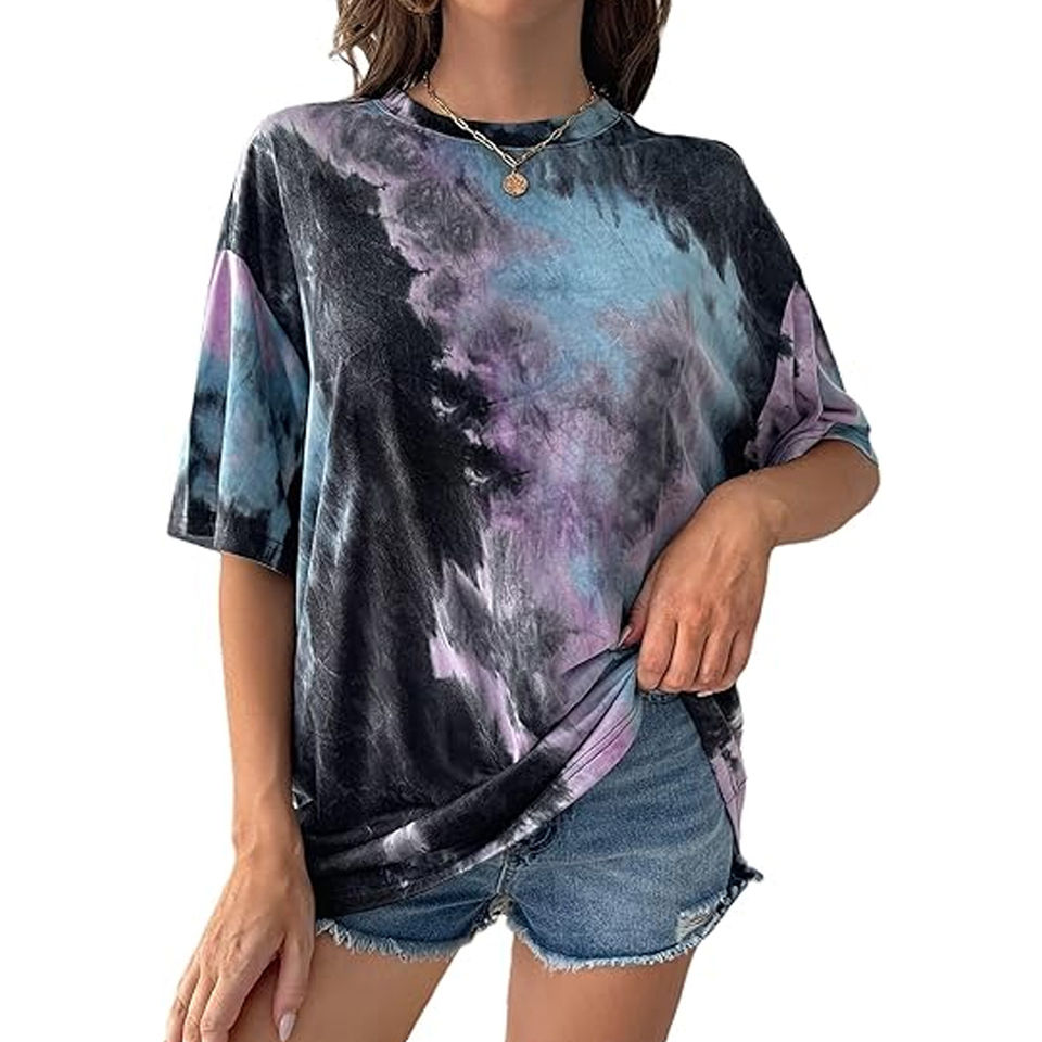 เสื้อยืดผู้หญิงไซส์ใหญ่ คุณภาพสูง ทรงหลวม ไหล่ตก พิมพ์ลายมัดย้อม ขายส่ง