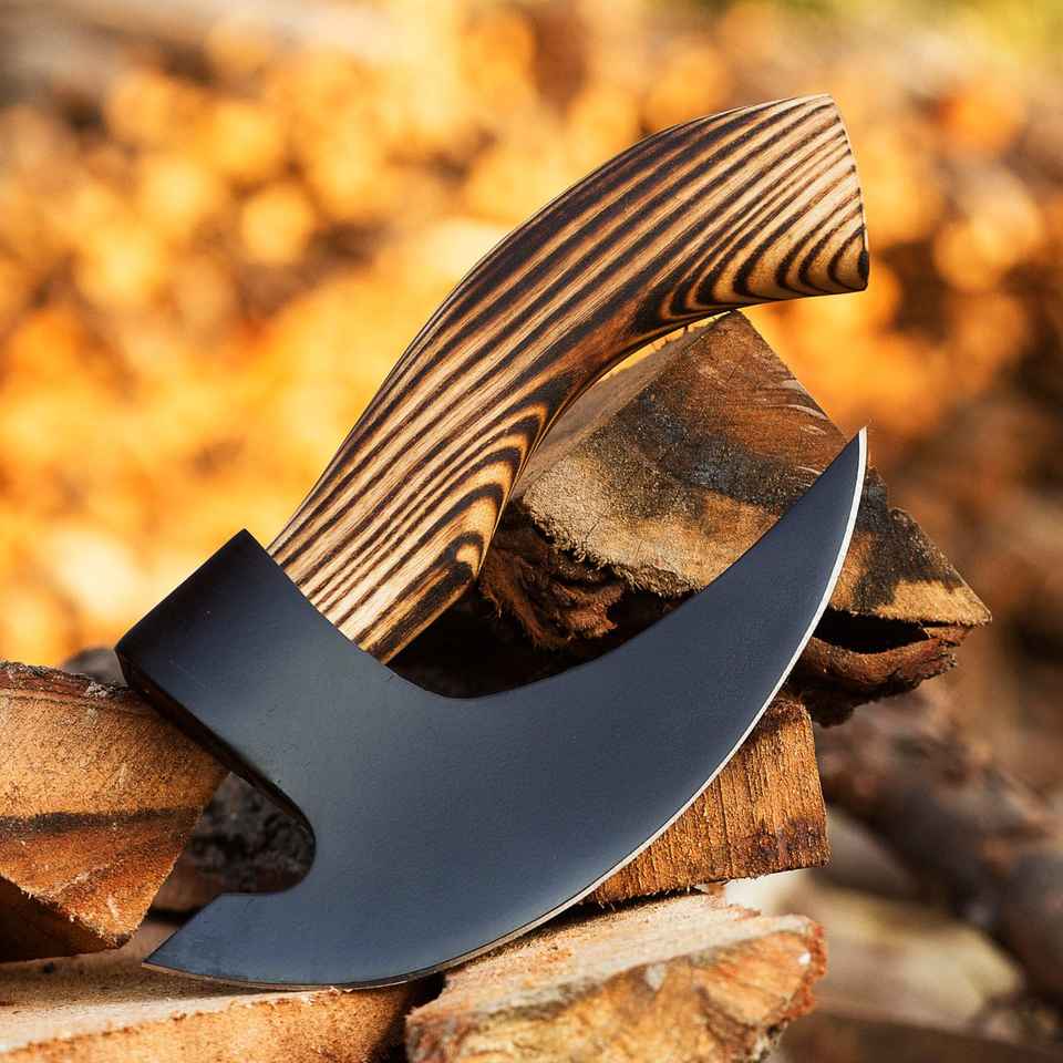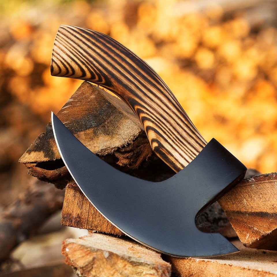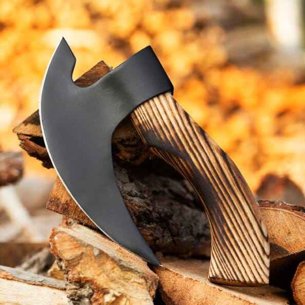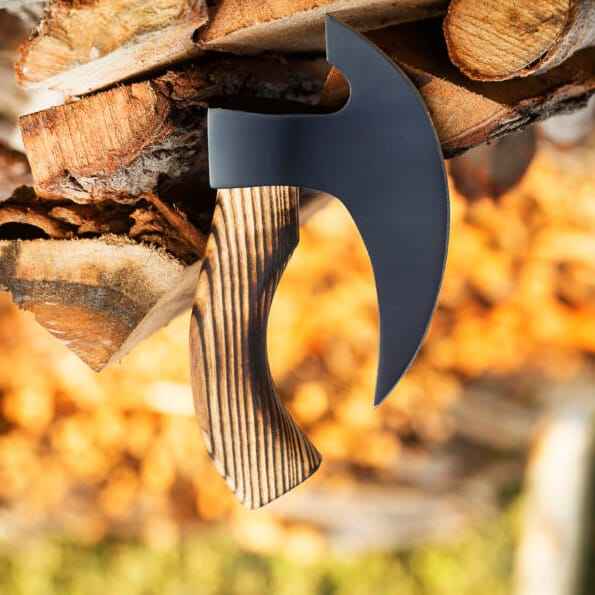 ขวานตัดพิซซ่าแบบวิกิ้ง ทำมือจากเหล็กกล้าคาร์บอนสูงเคลือบสีดำ เกรดอุตสาหกรรม พร้อมปลอกหนังและด้ามไม้
