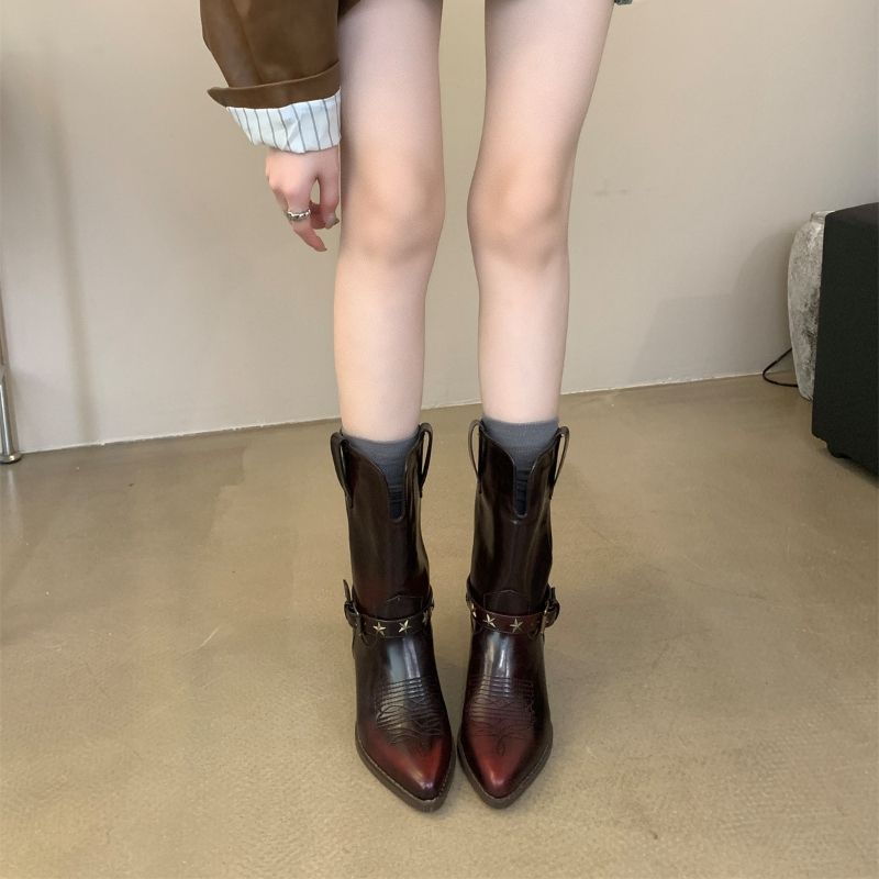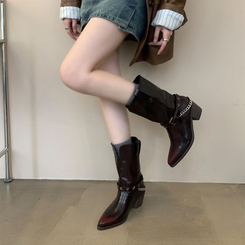 รองเท้าบูทคาวบอยสไตล์วินเทจสำหรับผู้หญิง ส้นหนา ปลายแหลม พื้นยาง พร้อมหัวเข็มขัดแบบสั้น สำหรับฤดูหนาว รับทำโลโก้ตามสั่งแบบดรอปชิป