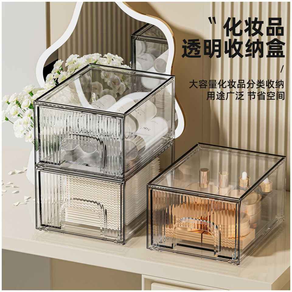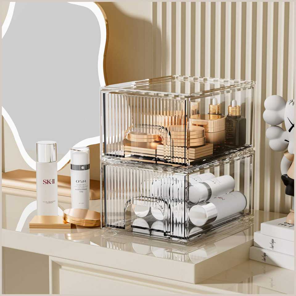 กล่องเก็บเครื่องสำอางใสแบบวางซ้อนกันได้อุปกรณ์จัดระเบียบและจัดเก็บในห้องน้ำ