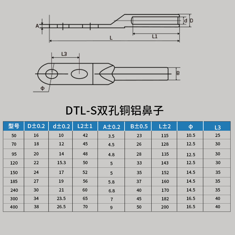 ขั้วต่อสายไฟแบบสองรู Dtl-S ทำจากทองแดงและอะลูมิเนียม สำหรับเชื่อมต่อสายไฟ ขนาด 50 70 95 120 150 185 240 300 400