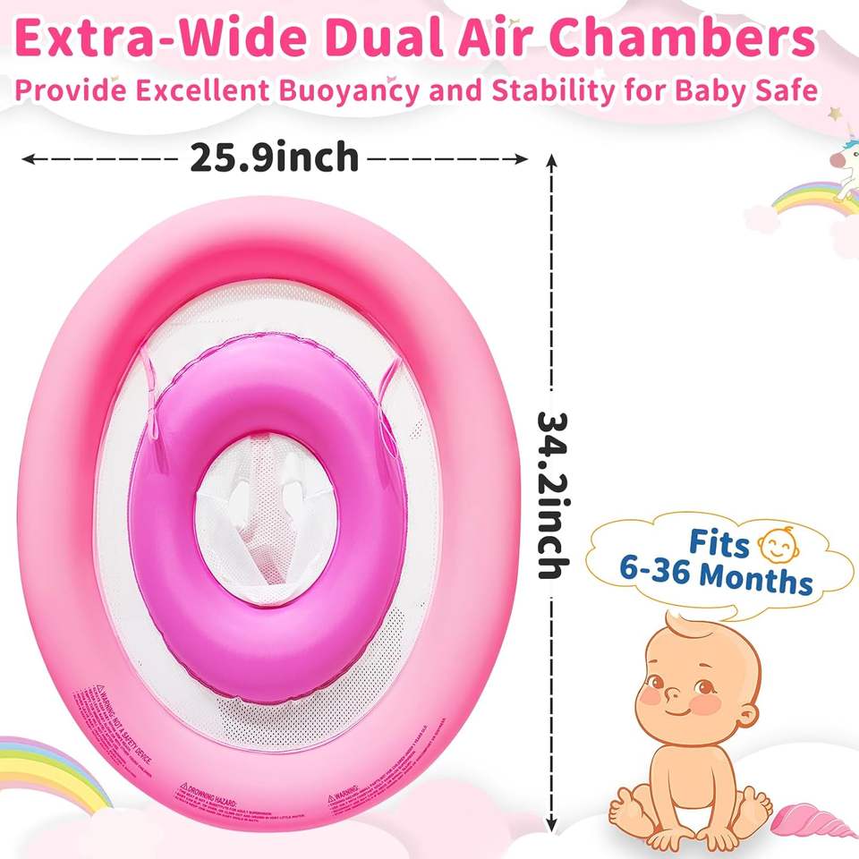 ห่วงยางว่ายน้ำยูนิคอร์นแบบสองช่องลมสำหรับเด็กทารกและเด็กเล็ก พร้อมหลังคาบังแดดปรับได้ 4 ระดับ