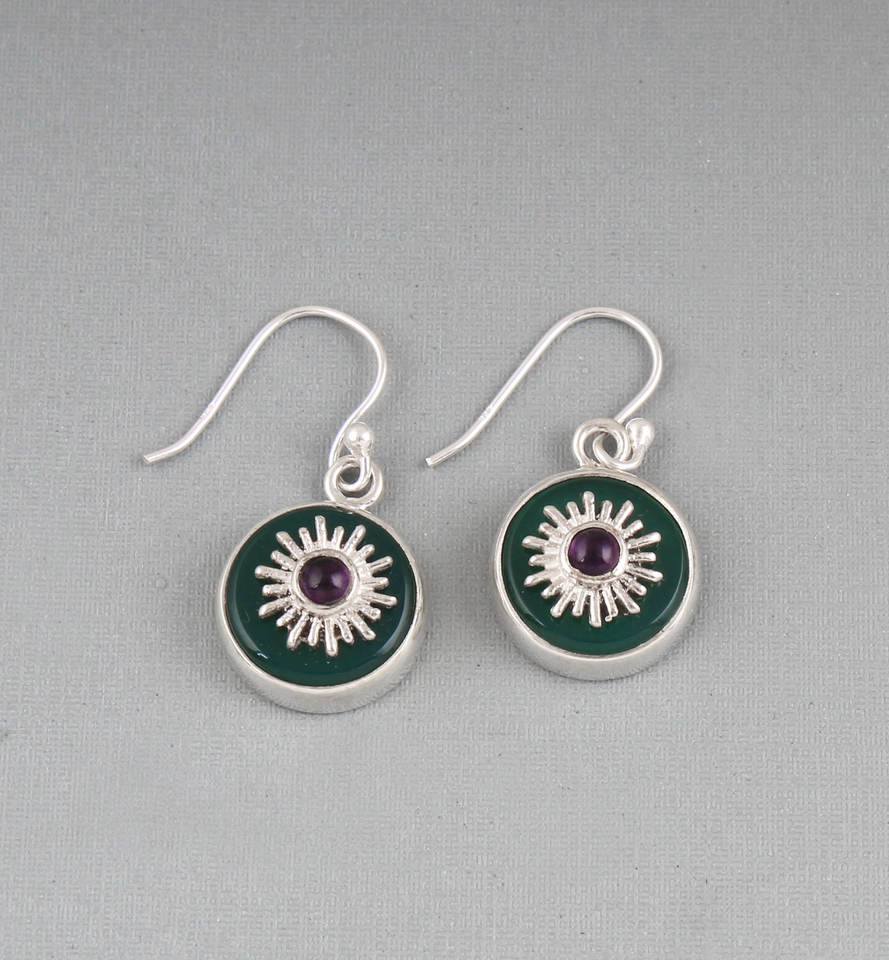 การผสมผสานคู่ของพลอยสีเขียวโอนิกซ์และอเมทิสต์การออกแบบดวงอาทิตย์ 925 ต่างหูเงินหยดห้อยผู้ผลิตเครื่องประดับ